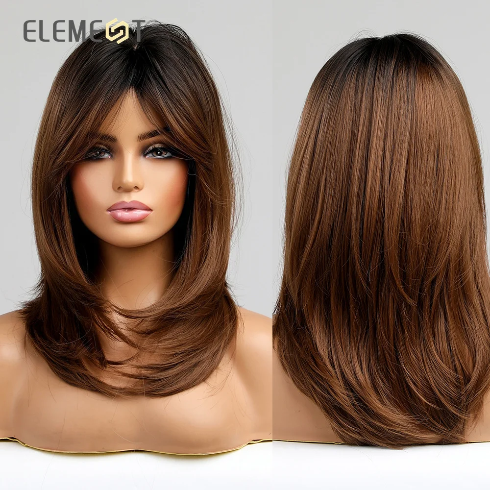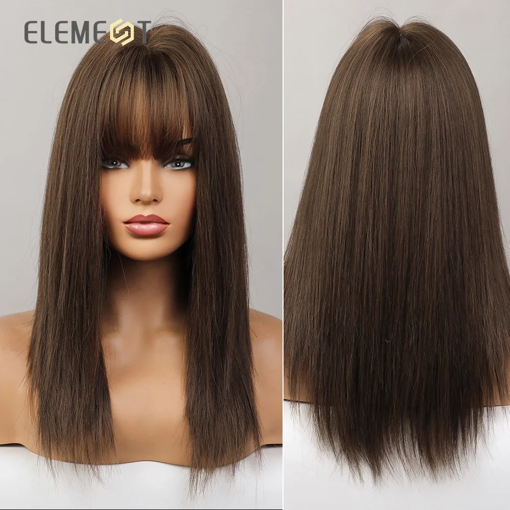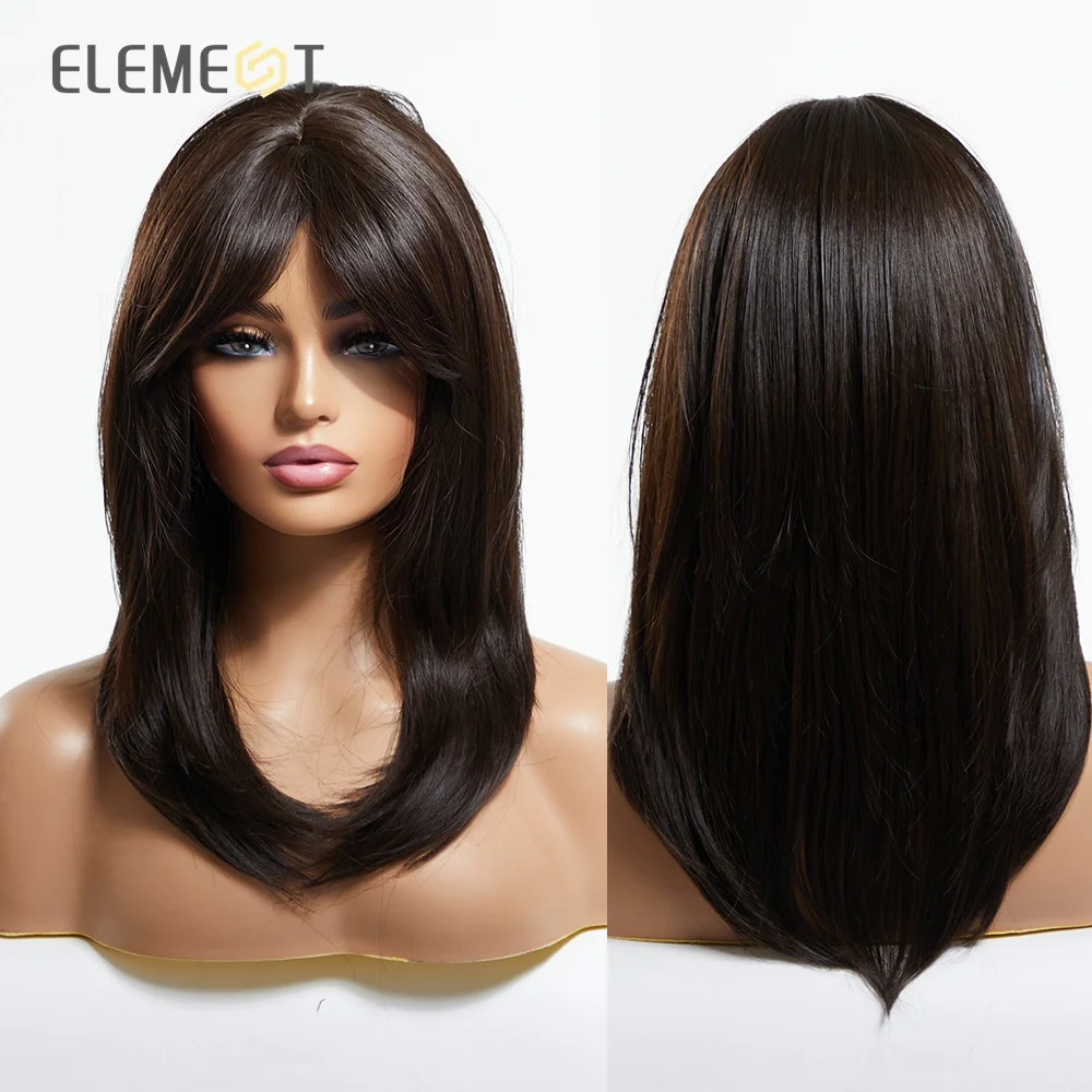 Парик из синтетического материала, Средний прямой парик из черного и коричневого цвета с челкой для женщин, жаростойкие Повседневные Вечерние волосы на голову
