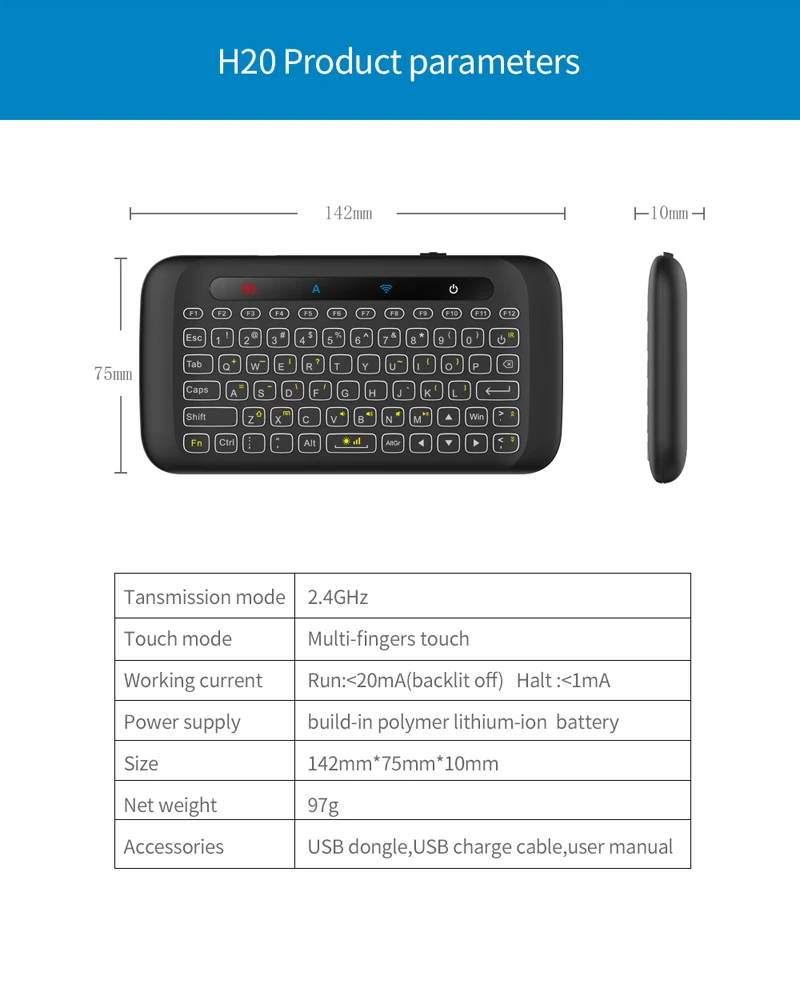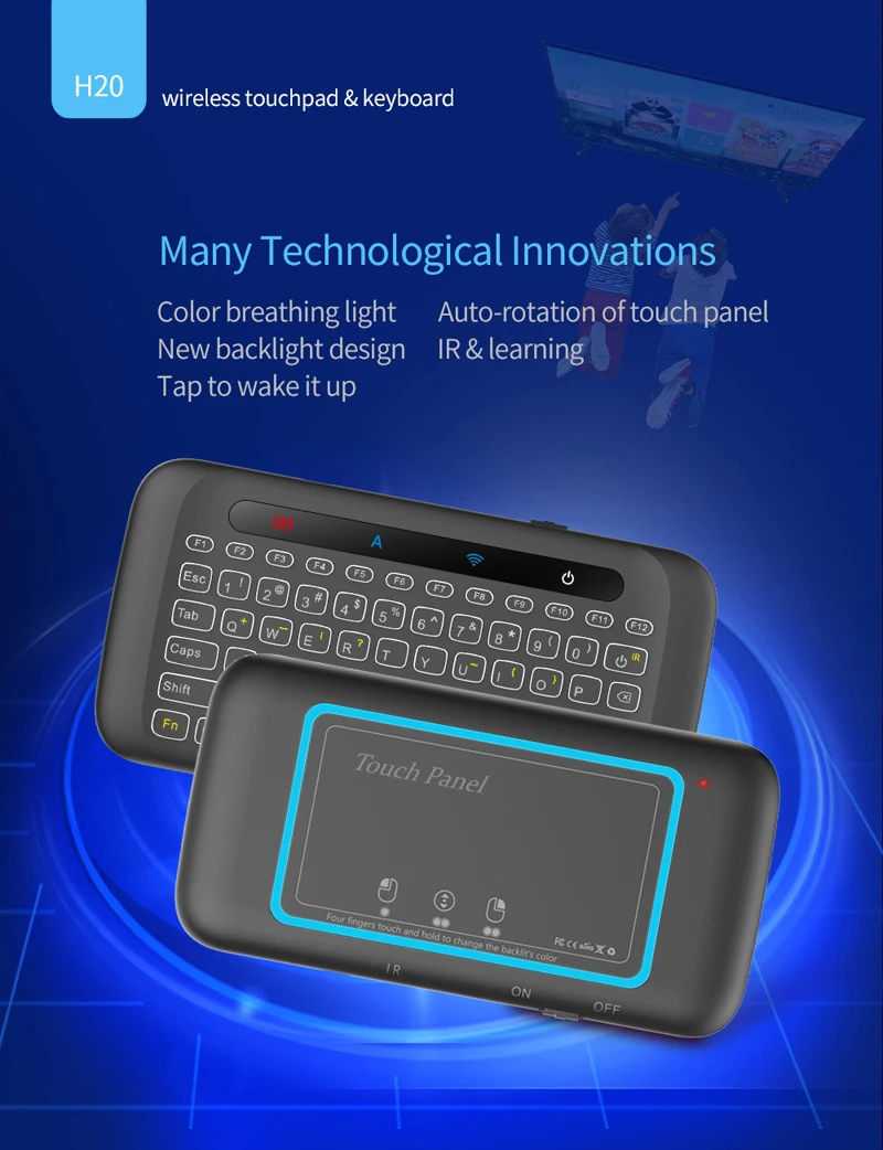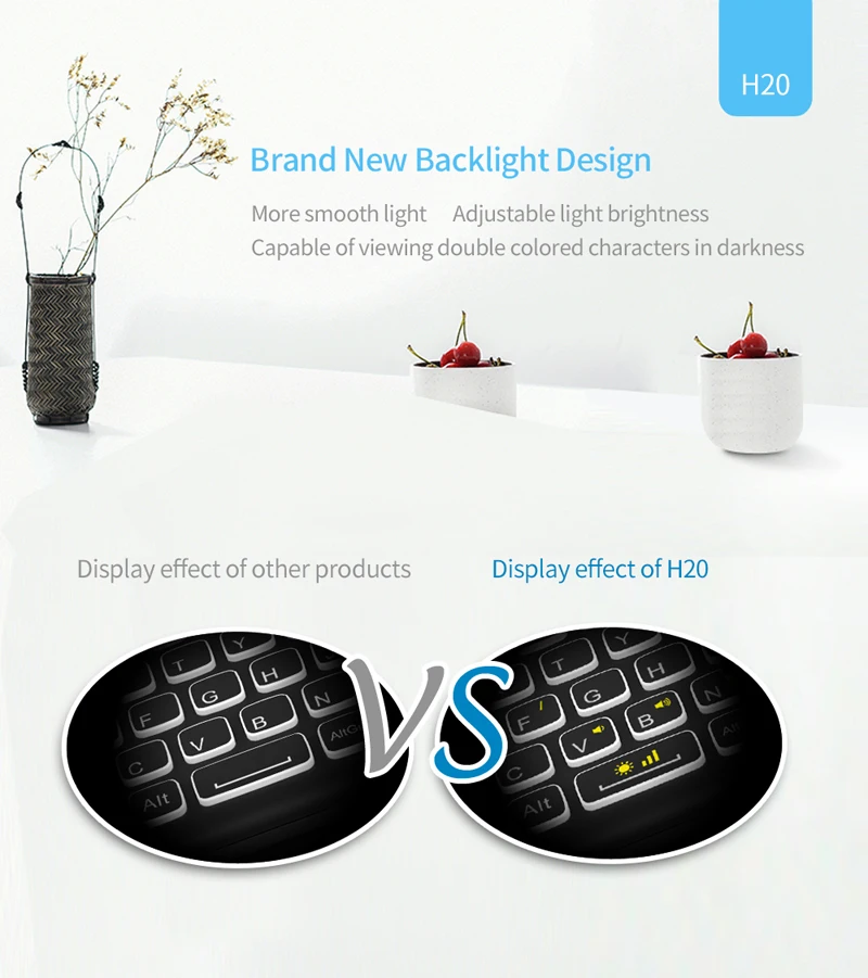 Это новая мини-клавиатура с беспроводной подсветкой H20 2,4G, она проста в использовании, вы можете использовать ее для электронной почты, чата, дистанционного управления, ввода сообщений и игр. Он совместим с ПК, ноутбуками, Mac OS, Linux, Android smart TV Box, Windows XP/7/8/10. Используйте его с Android TV Box или Smart TV на диване или просматривайте интернет в наиболее удобной моде.