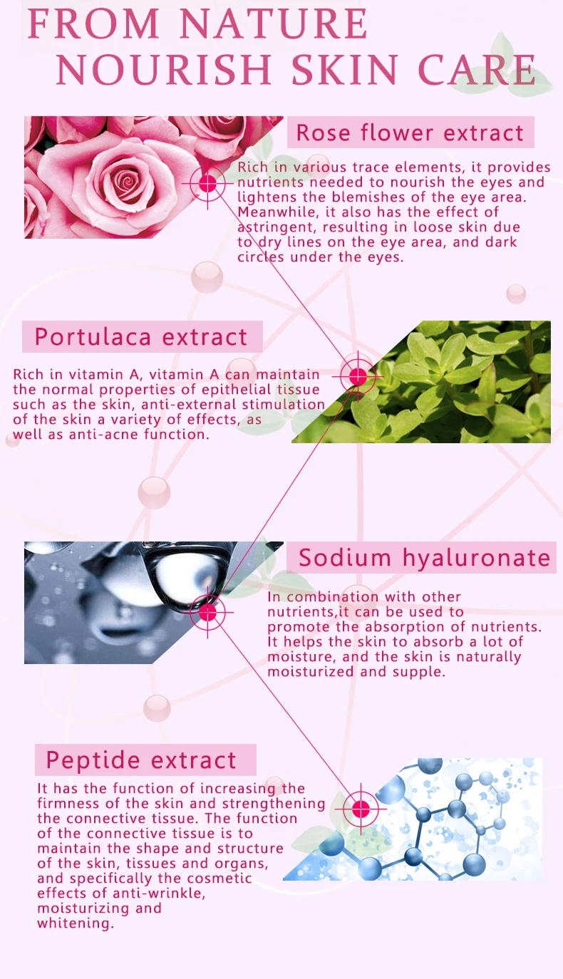 Содержит увлажняющий экстракт розы, богатый полипептид, текстуру и мягкую влажную кожу, может легко впитываться кожей, восстанавливать многократное питание, прощаться с сухой, тусклой, грубой кожей глаз, помогает осветлить кожу, нежность и твердость делают глаза гладкими и нежными, компактными и полными.