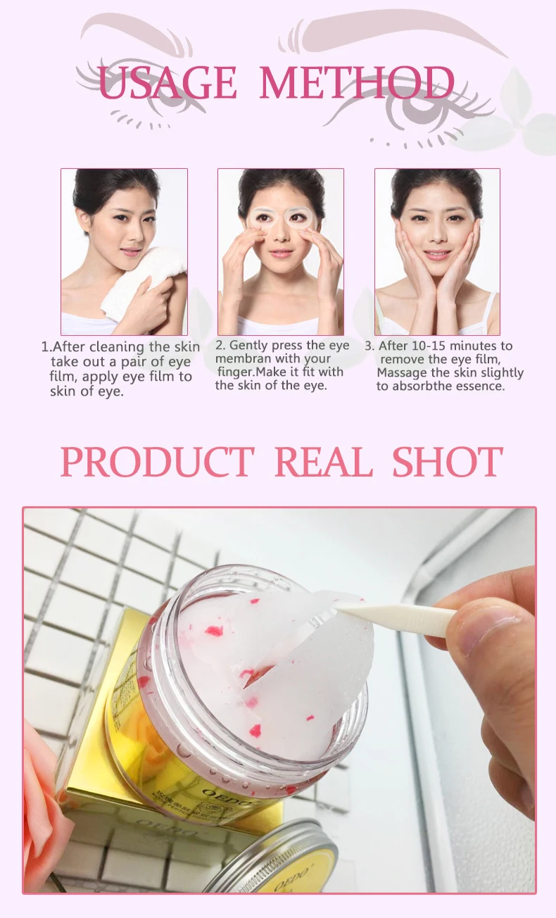 1 очистите кожу, удалите пару масок для глаз, маска для глаз нанесена на кожу глаз 2. Аккуратно прижмите маску для глаз пальцами, чтобы она соответствовала коже глаз 3 Подождите 10-15 минут, удалите маску, мягко массируйте кожу глаз, чтобы впитать эссенцию