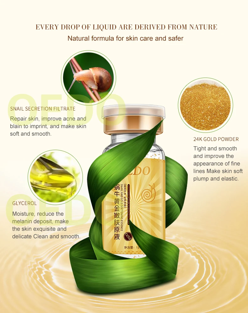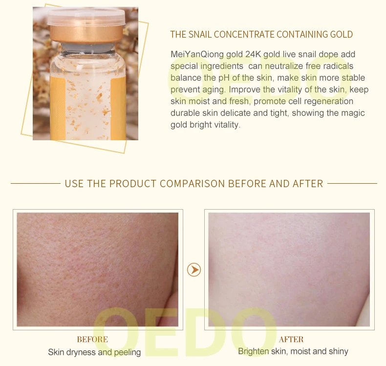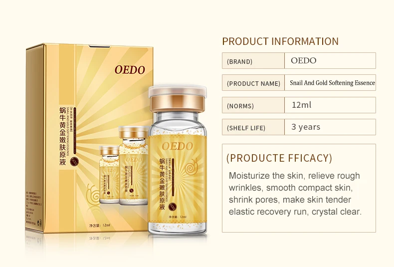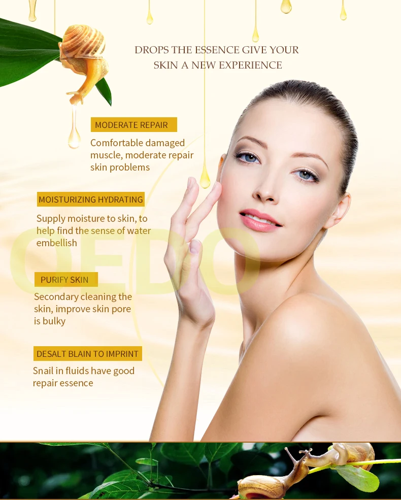 Содержит экстракт слизи улитки и золотой ингредиент, его текстура мягкая и влажная. Он может дать коже влагу и питание, чтобы помочь питать и увлажнять сухую кожу, а также улучшить сухое winkles, чтобы сохранить кожу нежной и гладкой для укрепления кожи и сужения пор, которые сохраняют нежную эластичность кожи. В конце концов, это делает вашу пухленькую, яркую и нежную.