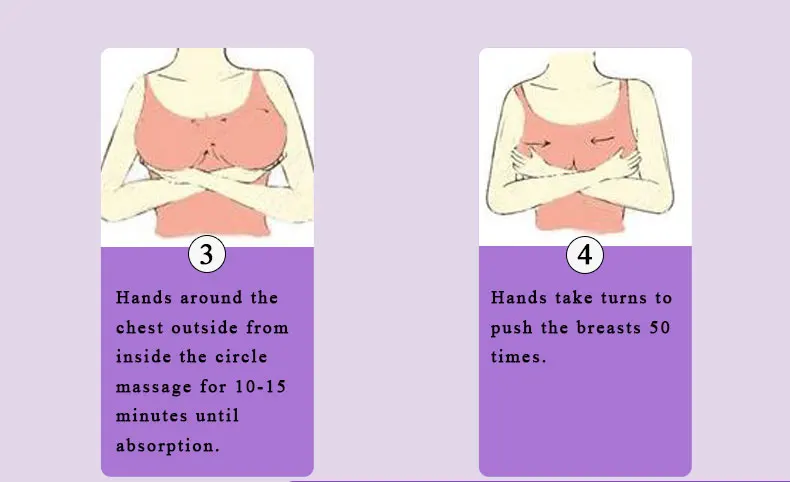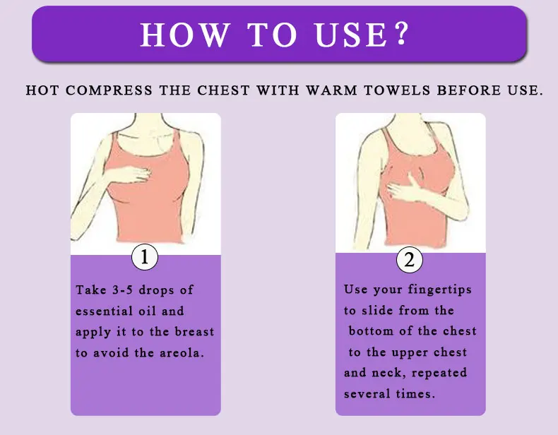 1. Горячее сжатие груди теплыми полотенцами перед использованием. 2. Возьмите 3-5 капель эфирного масла и нанесите его на грудь, чтобы избежать ареолы. 3. Руки вокруг груди снаружи изнутри массажа круга в течение 10-15 минут до впитывания.