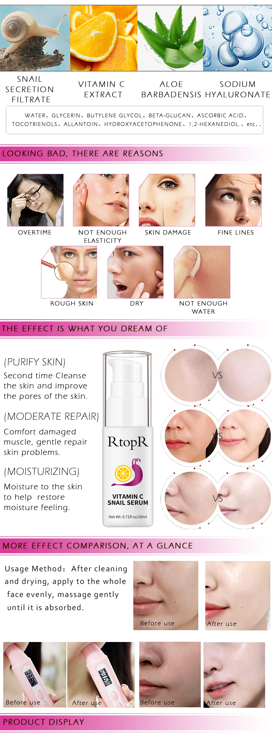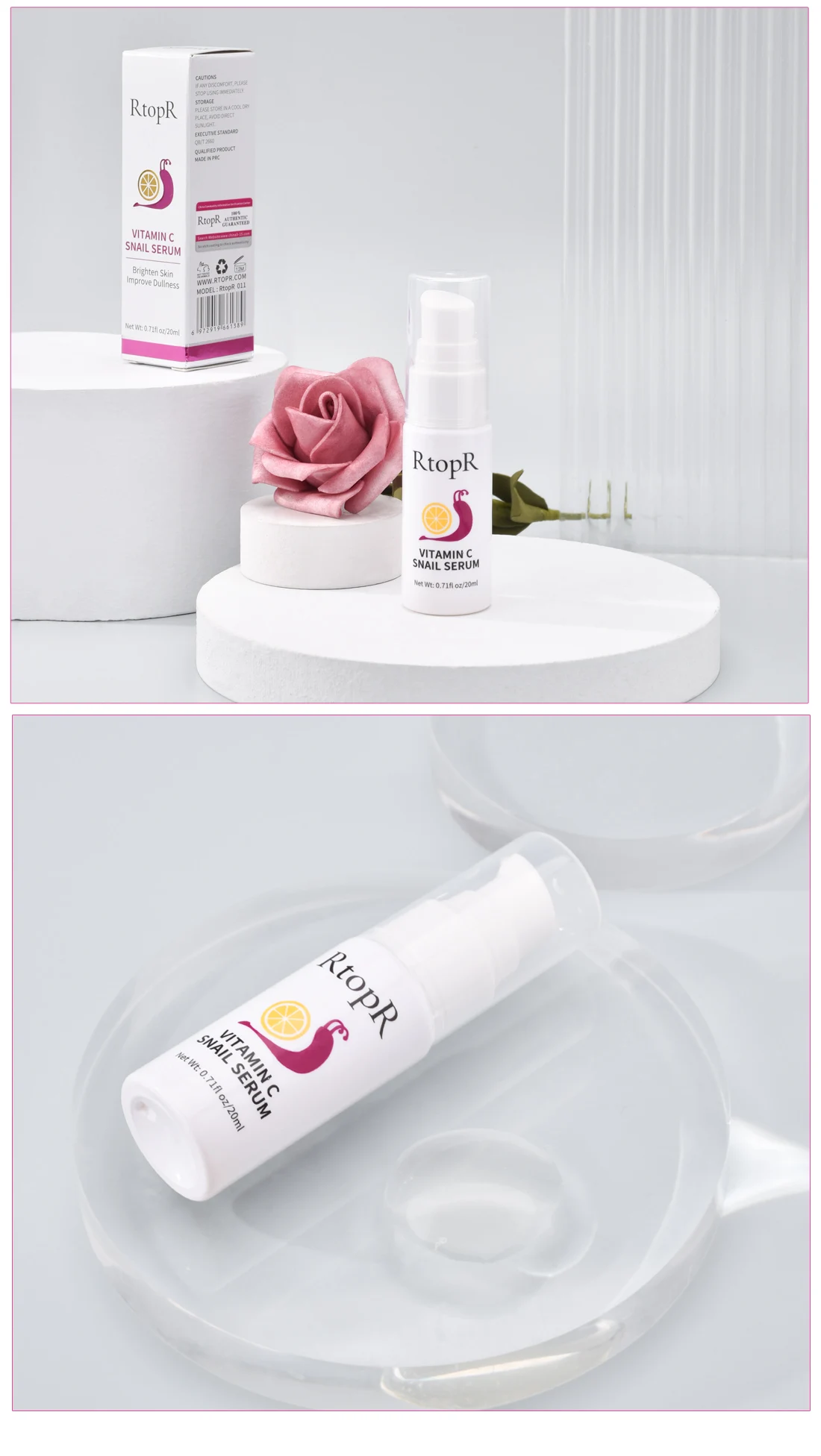 Богатый ингредиентами VC и фильтратом секреции улитки, может обеспечить питание нижней части кожи, эффективно уменьшает поколение меланина, повышает способность анти-окисления кожи, улучшает состояние кожи, например, темных пятен, отбеливает и осветляет цвет лица изнутри.