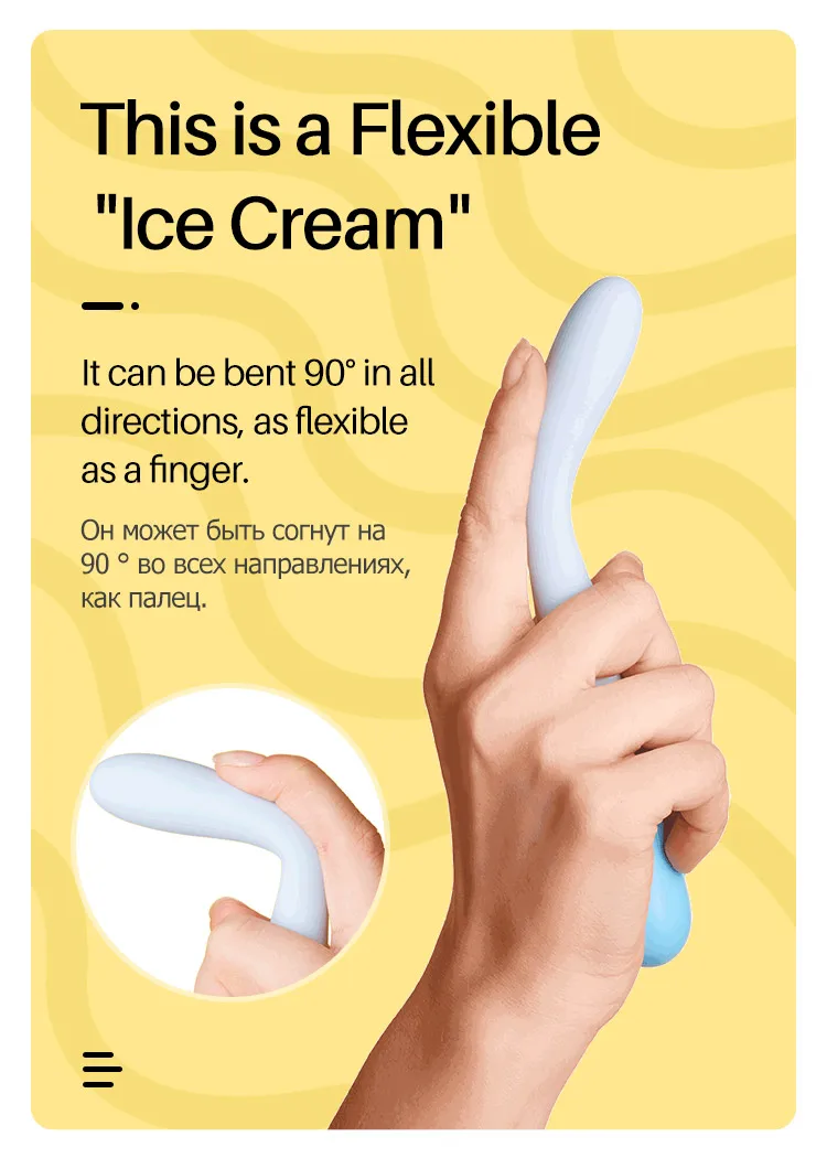 Основной Материал: пищевой силикон простой: прост в эксплуатации, аккуратно поверните нижнюю ручку, чтобы включить и Переключить. Безопасный материал: дизайн мороженого. Гибкая структура корпуса бара может сгибаться на 90 градусов во всех направлениях. Используется для массажа и флирта: массаж груди и чувствительных частей тела