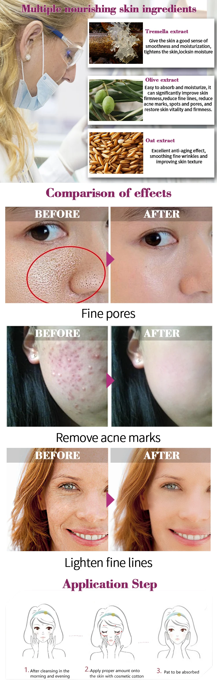 Содержит оливковые различные растительные экстракты, такие как, легко впитывают и увлажняют, что, очевидно, может улучшить герметичность кожи, тонкие линии значительно уменьшаются, акне, пятна и сужение пор, после непрерывного использования Омолаживающая отбеливающая смазка для подтяжки кожи.