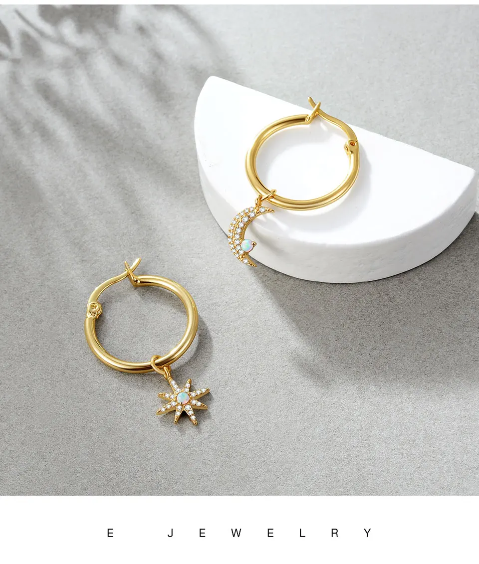 Очаровательные серьги-кольца с Луной звездой. В процесс электрофореза добавляется специальное антипотускненное покрытие, которое сохранит его блеск и блеск. Технология покрытия 14K золотом делает наши серьги очень прочными, так что они могут прослужить долгие годы. Опал и фианит-это ремесло с зубцами, прочное и не легко отвалится.