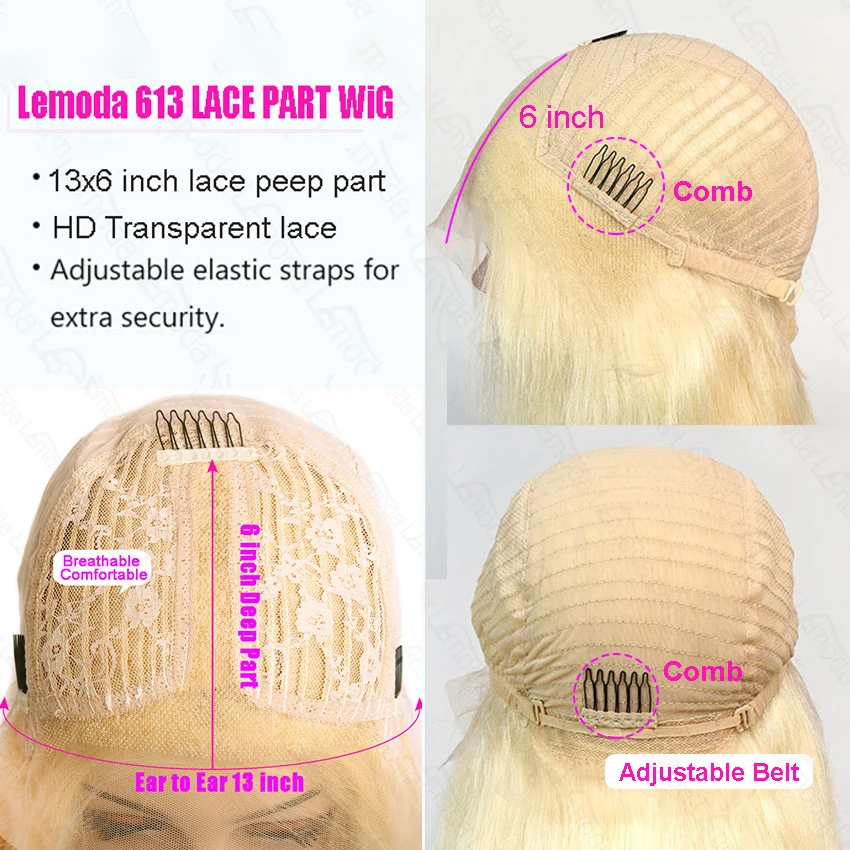 1. Название бренда: Lemoda 150% плотность волос 2. Материал: перуанский парик из человеческих волос 3. Текстура волос: 4x4 парик 4. Цвет волос: 613 13x4 парик с кружевной передней частью Могут быть окрашены и отбеленные 5. Длина волос: 8-26 дюймов парик в наличии 6. Вес волос: 133 г-244 г 7. Доставка: Доставка в течение 24 часов, 3-5 дней Прибыл