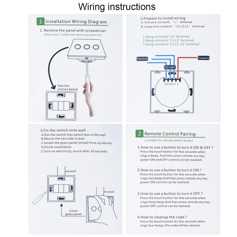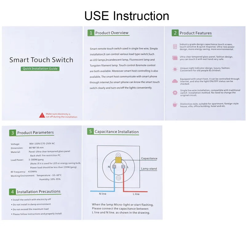 1x ЕС/Великобритания сенсорный экран переключатель, 2x крепежные винты, 1x конденсатор, 1x руководство.