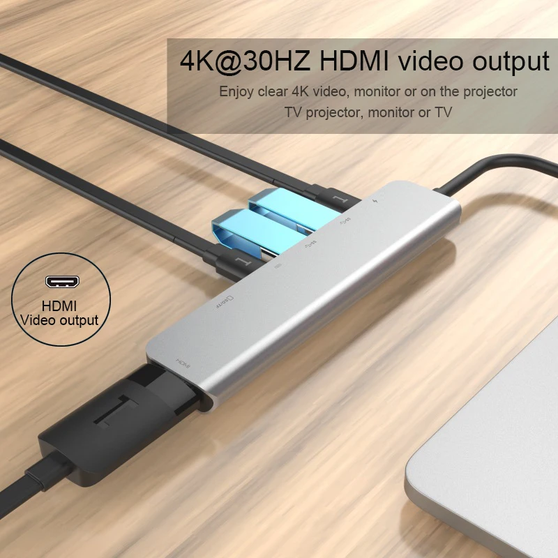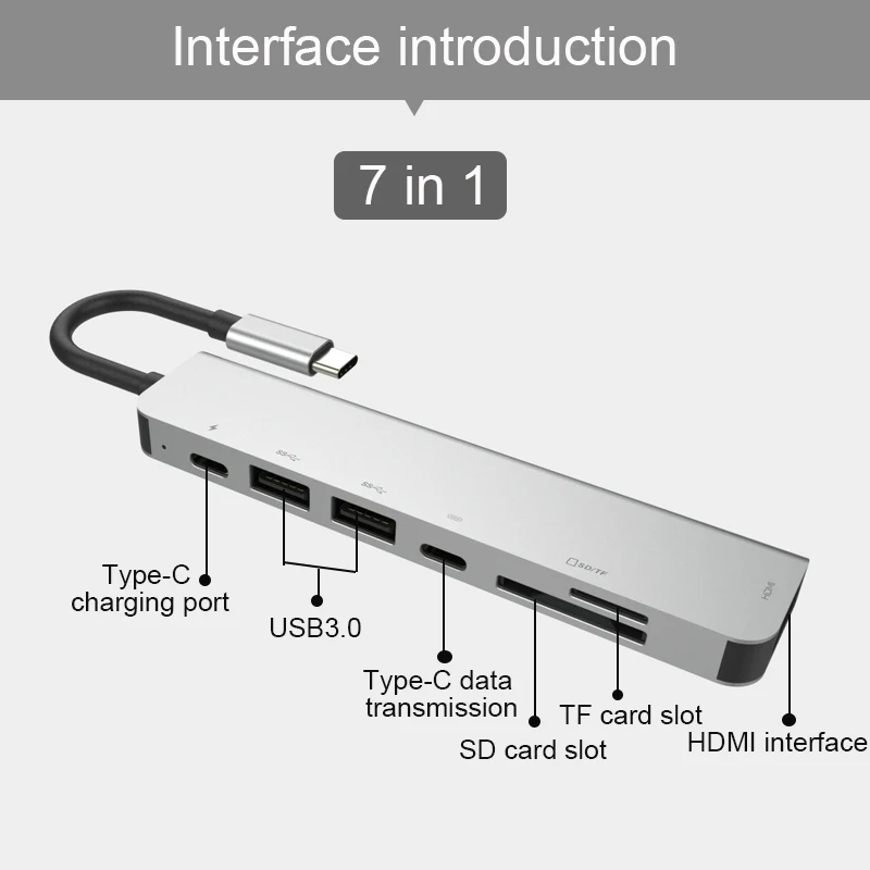 7 в 1 концентратор: 2 * usb3.0 + 1 * hdmi + 1 * Зарядка PD + 1 * Тип c + SD + TF