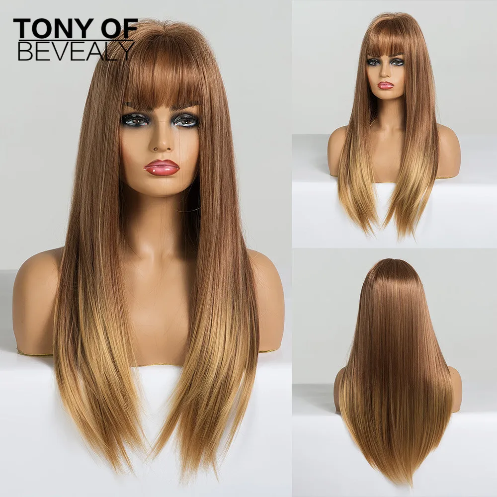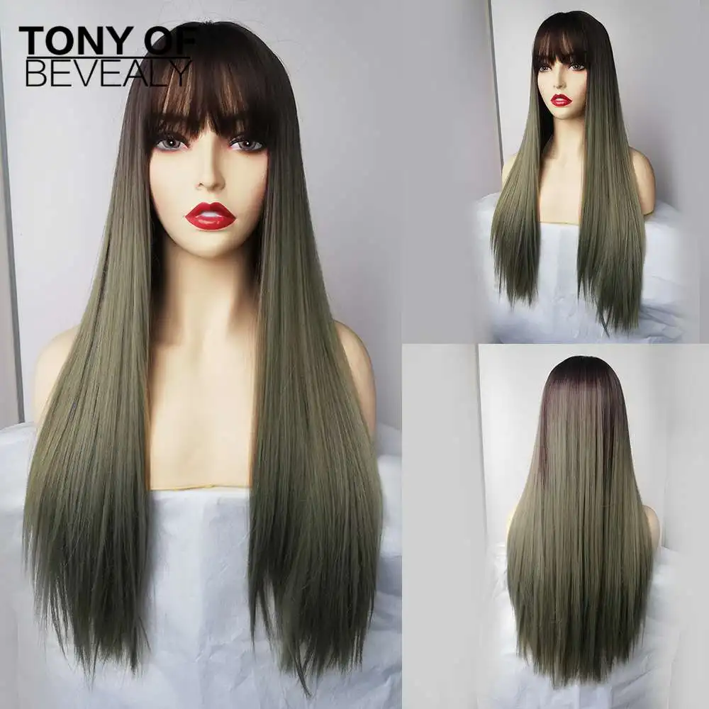 Длинные прямые синтетические парики с челкой Омбре коричневые зеленые натуральные волосы парики для женщин Косплей парики термостойкие волокна парики