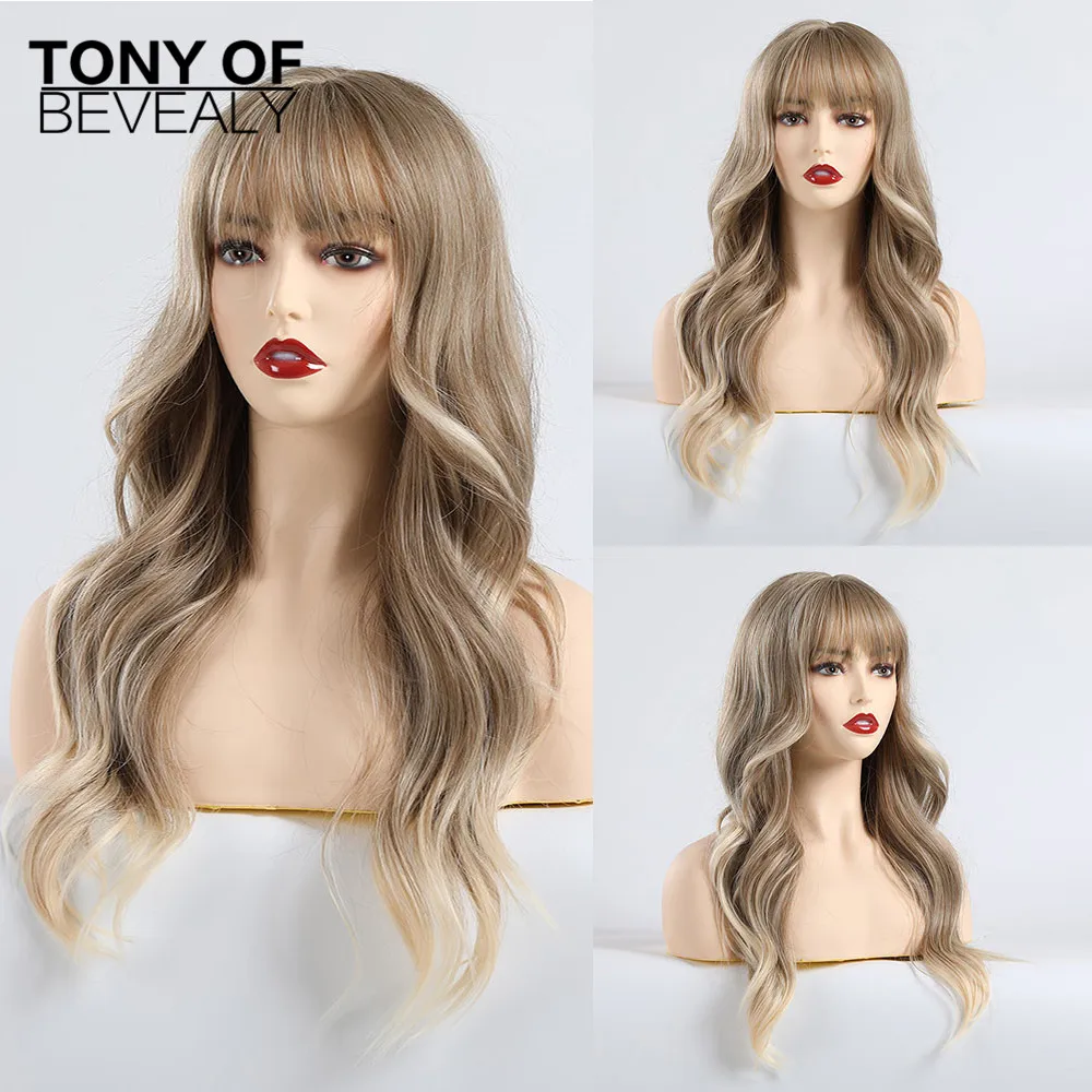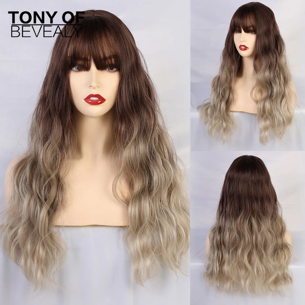 Женские длинные волнистые парики из светлых волос с эффектом омбре и пушистыми воздушными челками, термостойкие синтетические парики, парики из натуральных волнистых волос