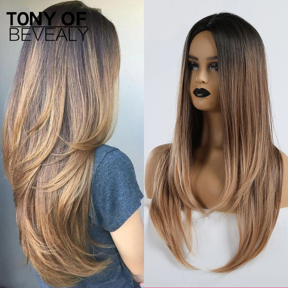 Длинный синтетический Омбре коричневый Светлый парик для косплея средняя часть парик из натуральных волос для черных женщин длинные волнистые термостойкие волокна парики