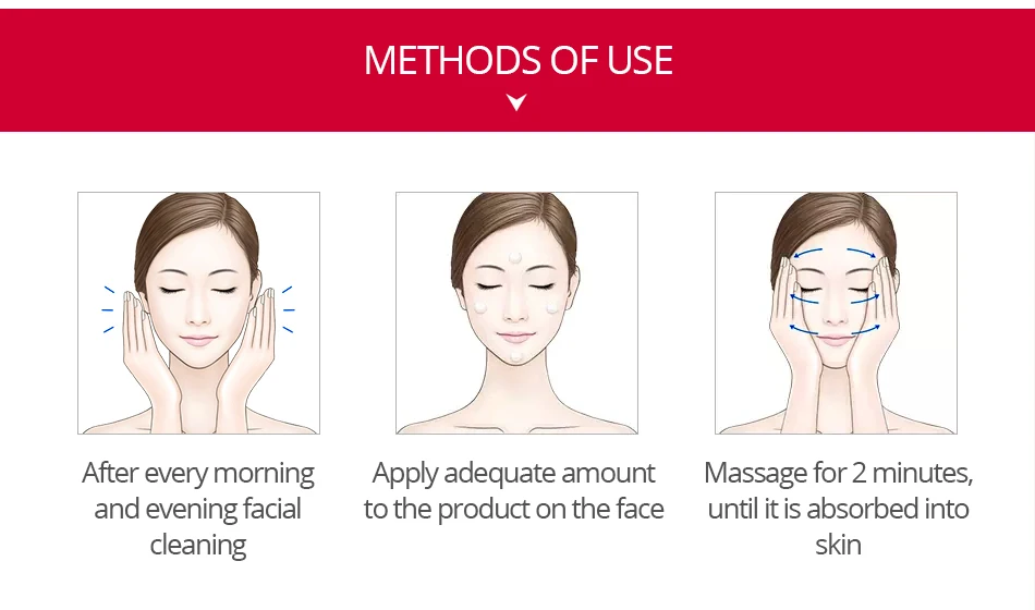 1. После того, как утром и вечером лица с очищающим средством для ног 2. Нанесите достаточное количество товара на лицевой стороне корпуса 3. Массаж в течение 2 минут, до тех пор, пока он не впитывается в кожу