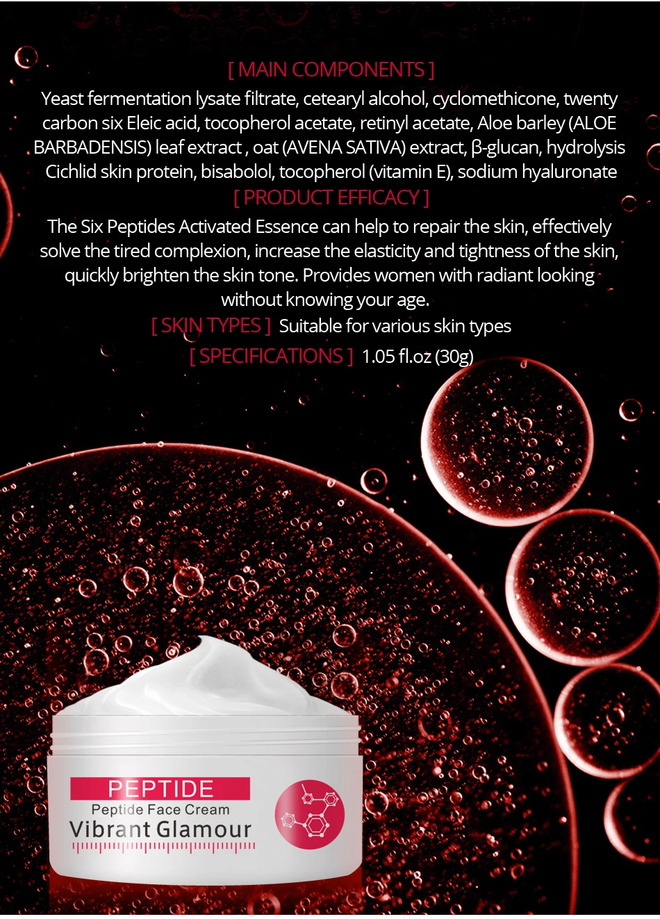 【Основные COMPONENTS】 дрожжевой сахаромицеты, лизат, фильтрата, цетеариловый спирт, циклометикон, tvventy углерода шесть Eleic кислота, токоферол ацетат, ретинилацетат, алоэ ячменя алоэ. BARBADENSIS eaf экстракт овса, AVENA SATIVA экстракт, глюкан, гидролиз цихлид белок кожи, бисаболол, токоферол витамин Е, гиалуронат натрия 【Наименование эффективность 】 шесть пептидов активированный эссенция может помочь для восстановления кожи, эффективно решает уставший цвет лица, повышают эластичность и подтянутость кожи, быстро осветляет кожу тон. Предоставляет женщинам сияющая без каких-либо, зная, что ваша возраст. 【 Типов кожи 】Suitable для различных типов кожи 【SPECIFICATIONS】 1,05 унций (30 г)