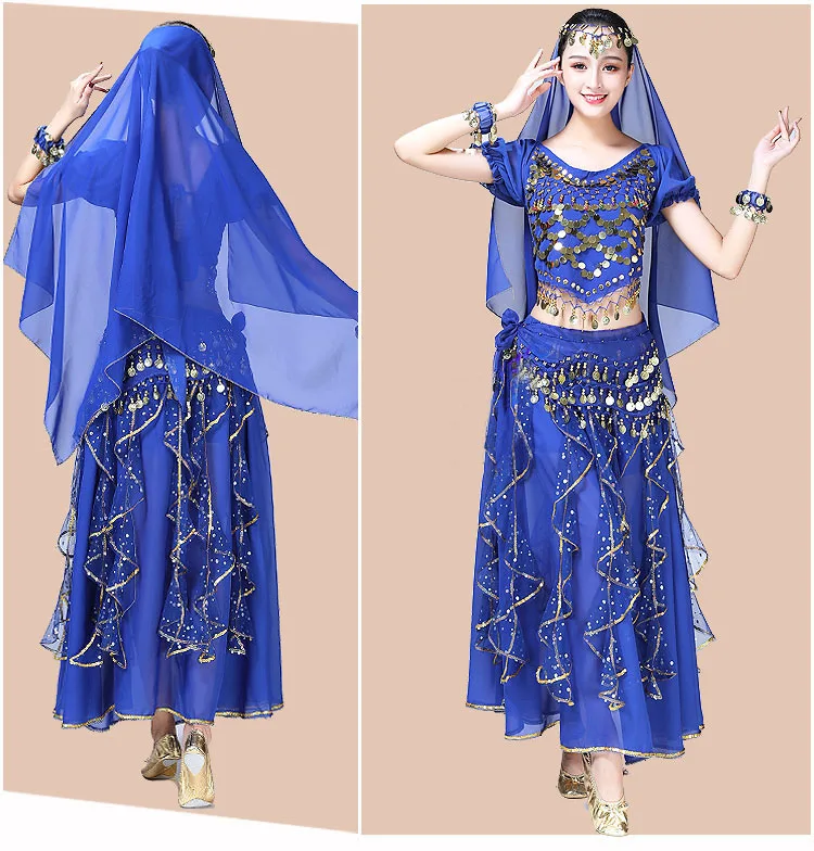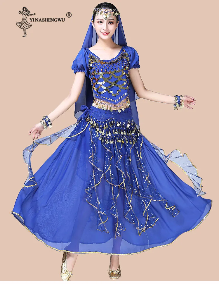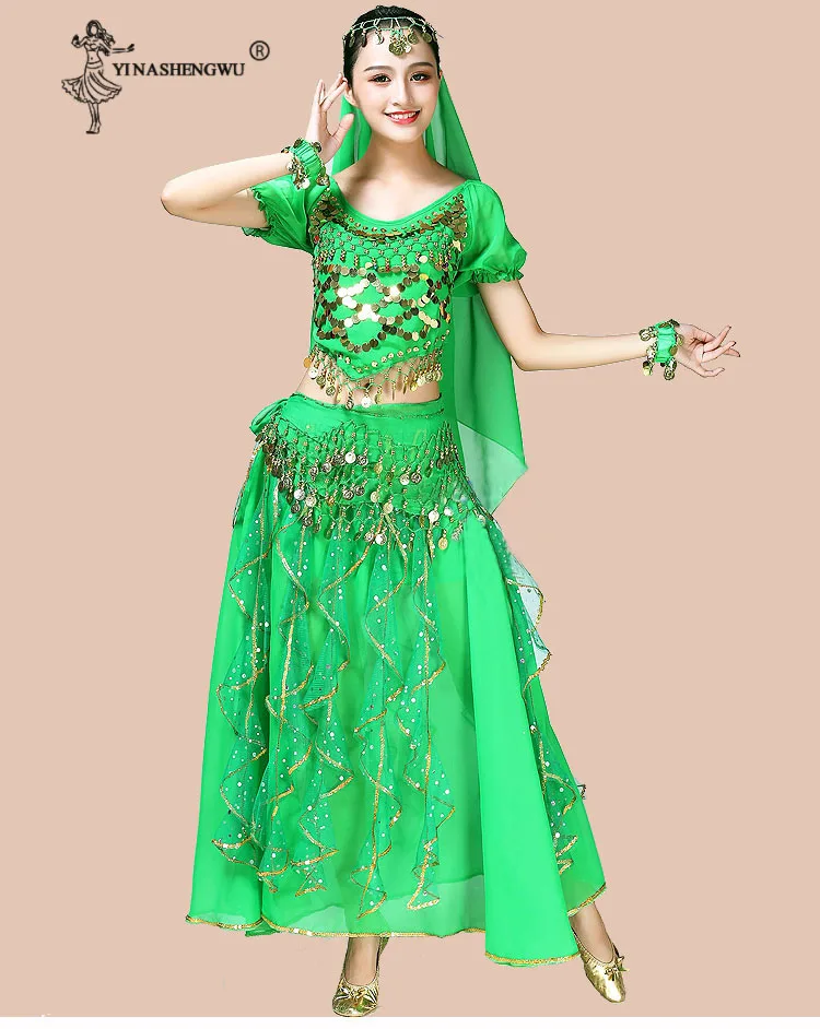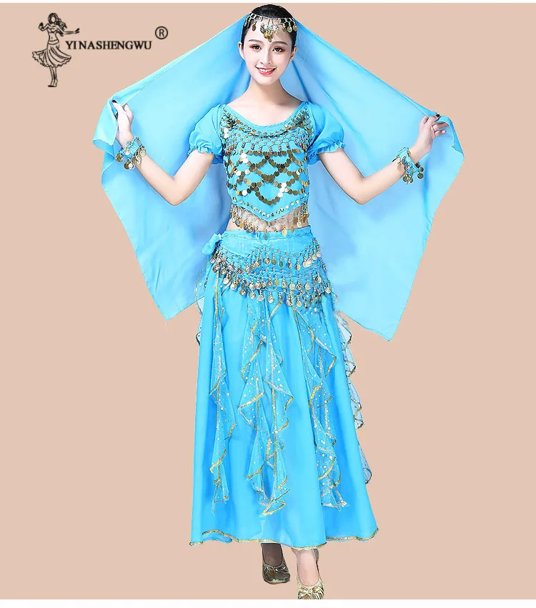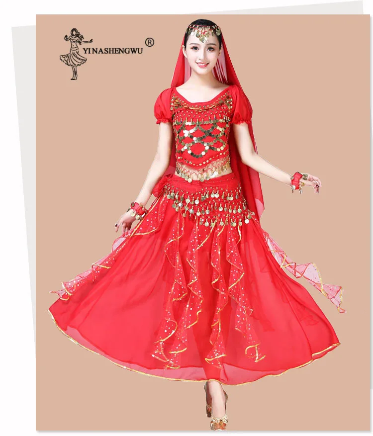 Женская одежда для танца живота, индийское сари, костюм для восточных танцев Болливуда, комплект для танца живота, топ с блестками, юбка с оборками, пояс