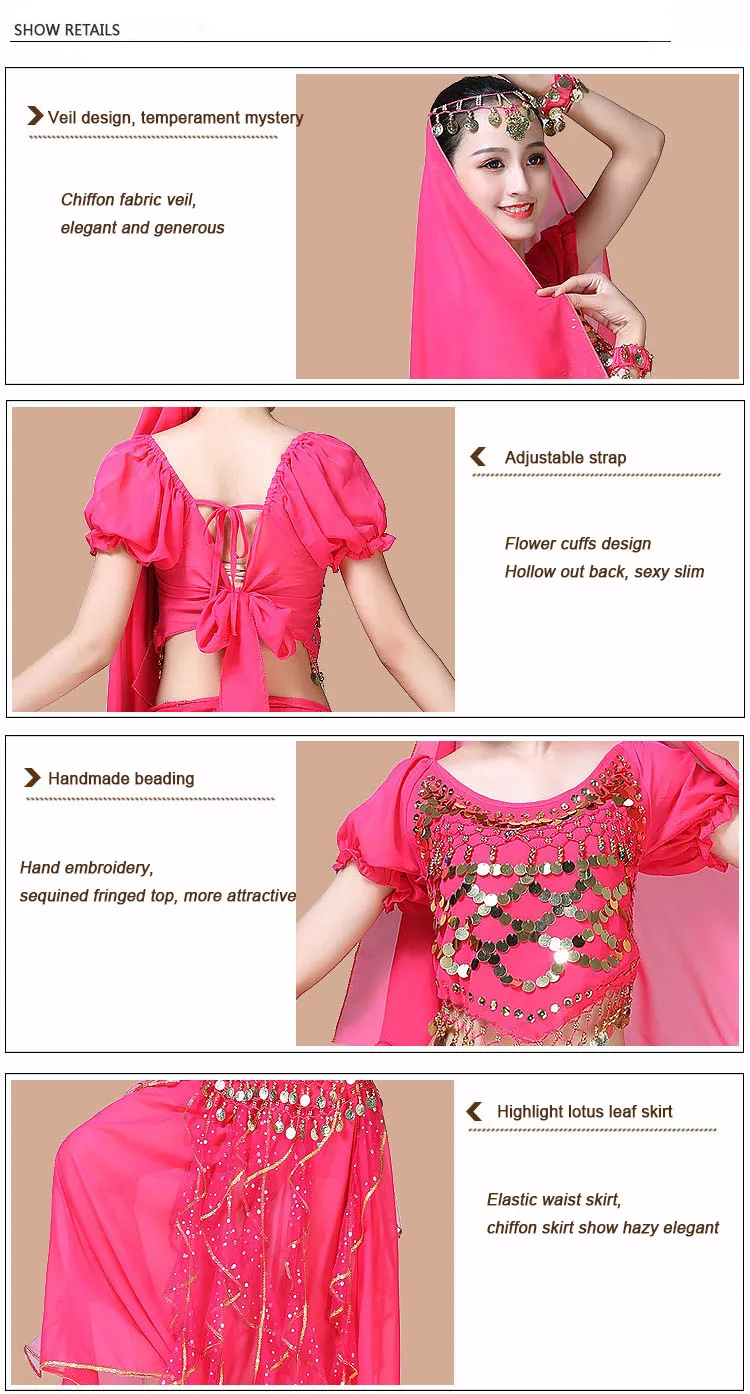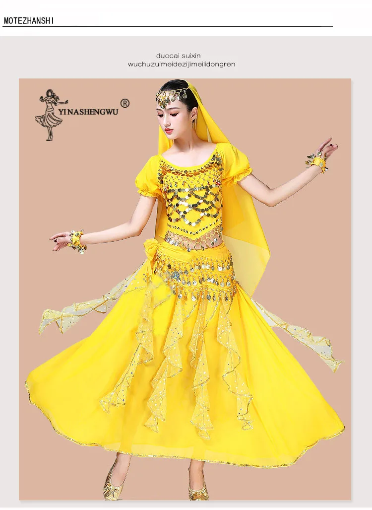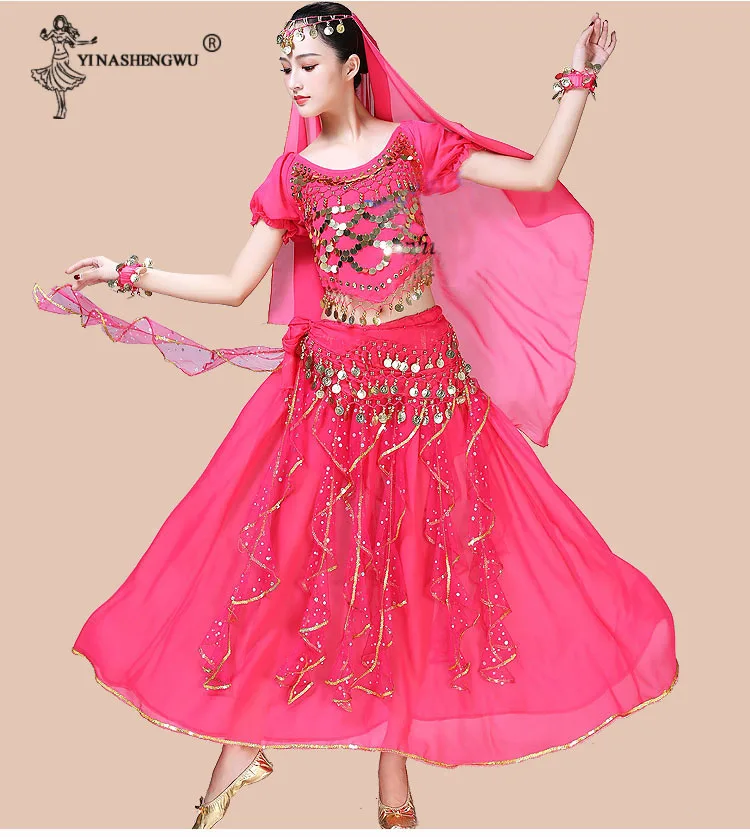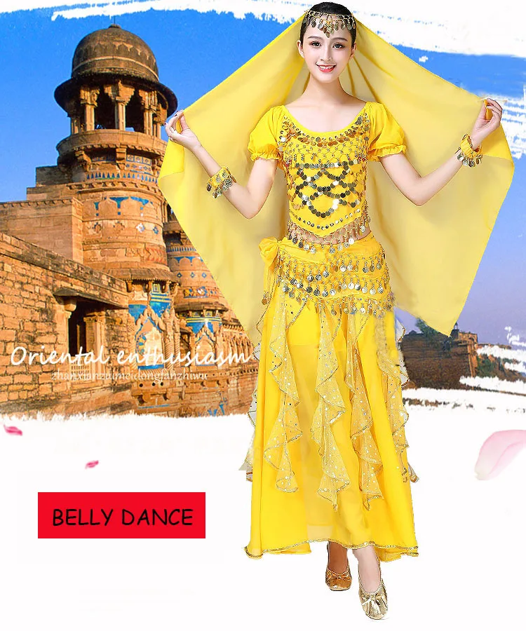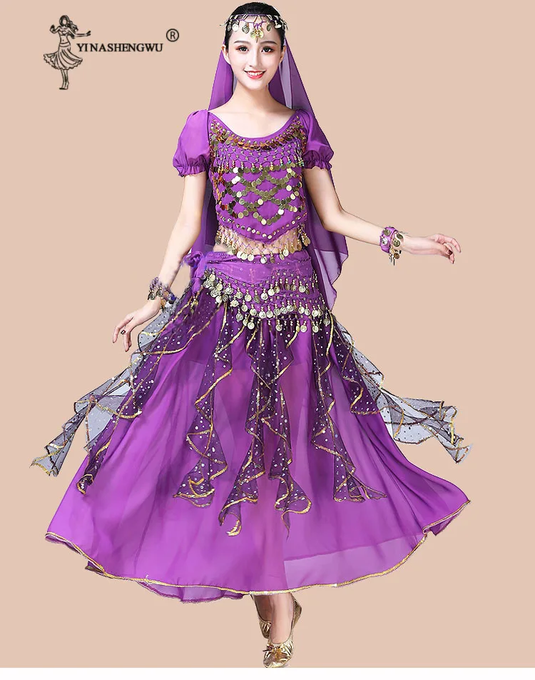 Женская одежда для танца живота, индийское сари, костюм для восточных танцев Болливуда, комплект для танца живота, топ с блестками, юбка с оборками, пояс