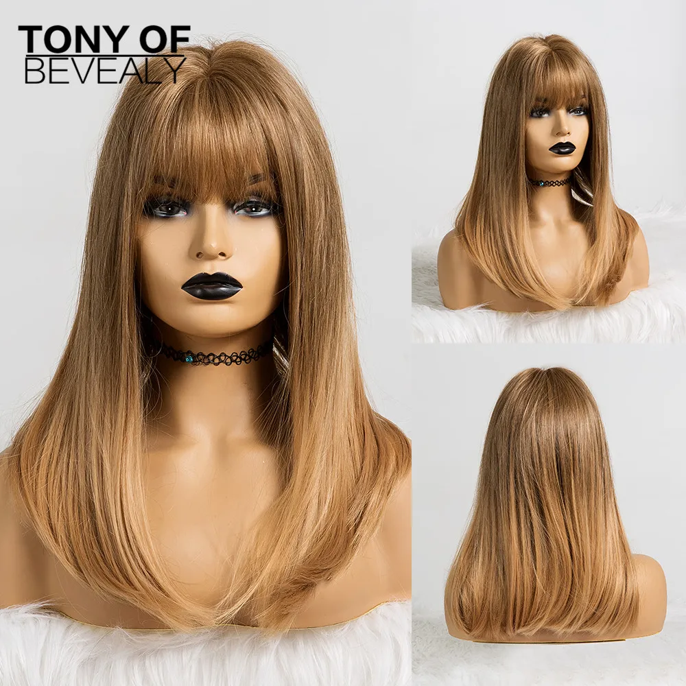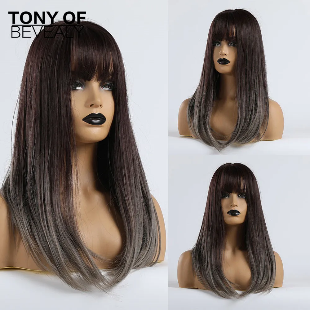 Длинные прямые синтетические парики с челкой Омбре коричневые натуральные повседневные парики из натуральных волос для вечеринки для черных женщин термостойкие волокна парики