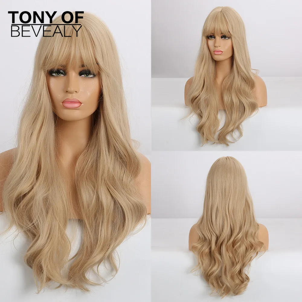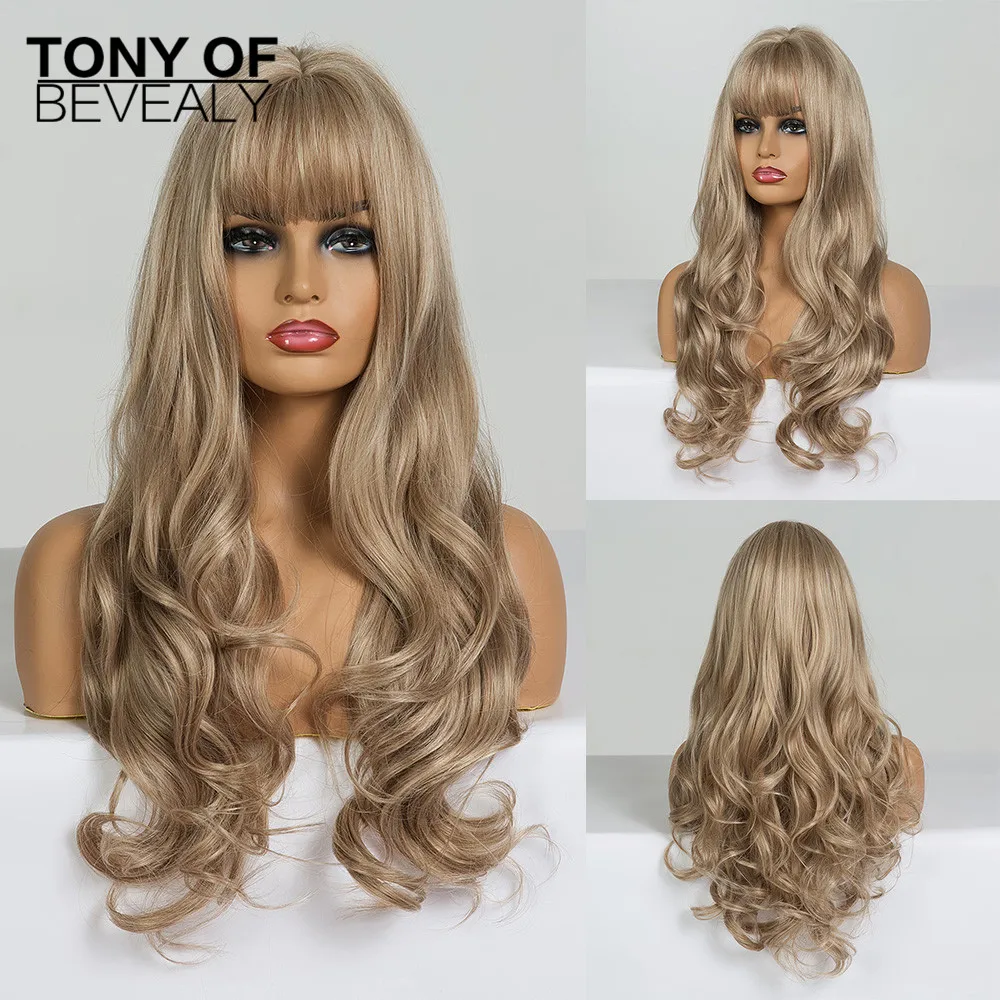 Длинный волнистый светильник, коричневые синтетические парики с челкой для женщин, афро-американские натуральные повседневные парики для волос, Термостойкое волокно