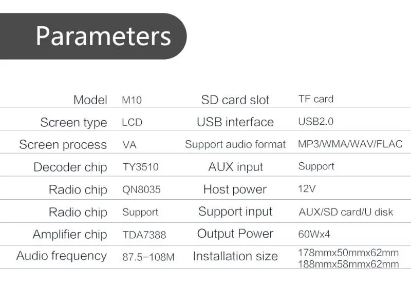 Интерфейс USB и количество: 2 порта (USB 1: чтение музыки на u-диске; USB 2: Зарядка мобильных телефонов)