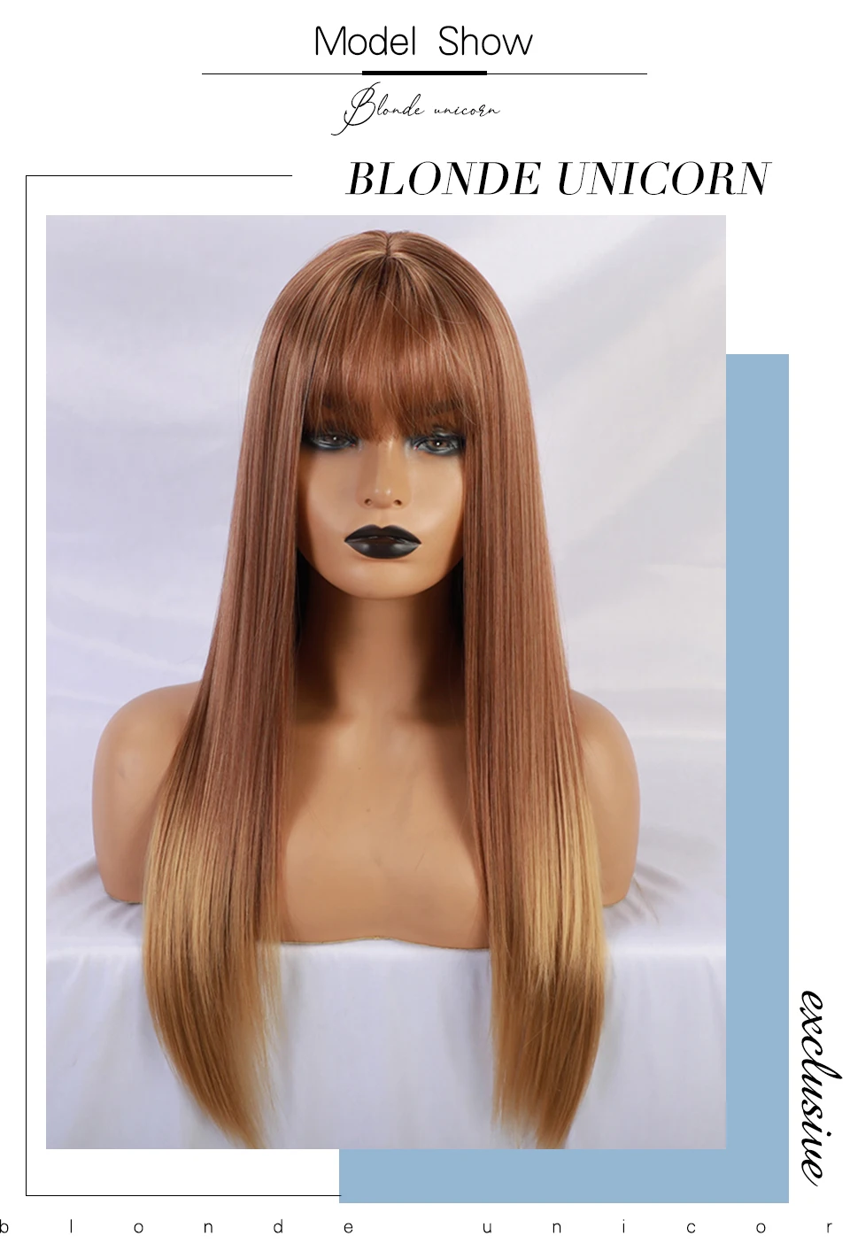 Парики для косплея, длинные, прямые, с челкой, с единорогом, синтетические, Омбре, вечерние, черные/белые, для женщин