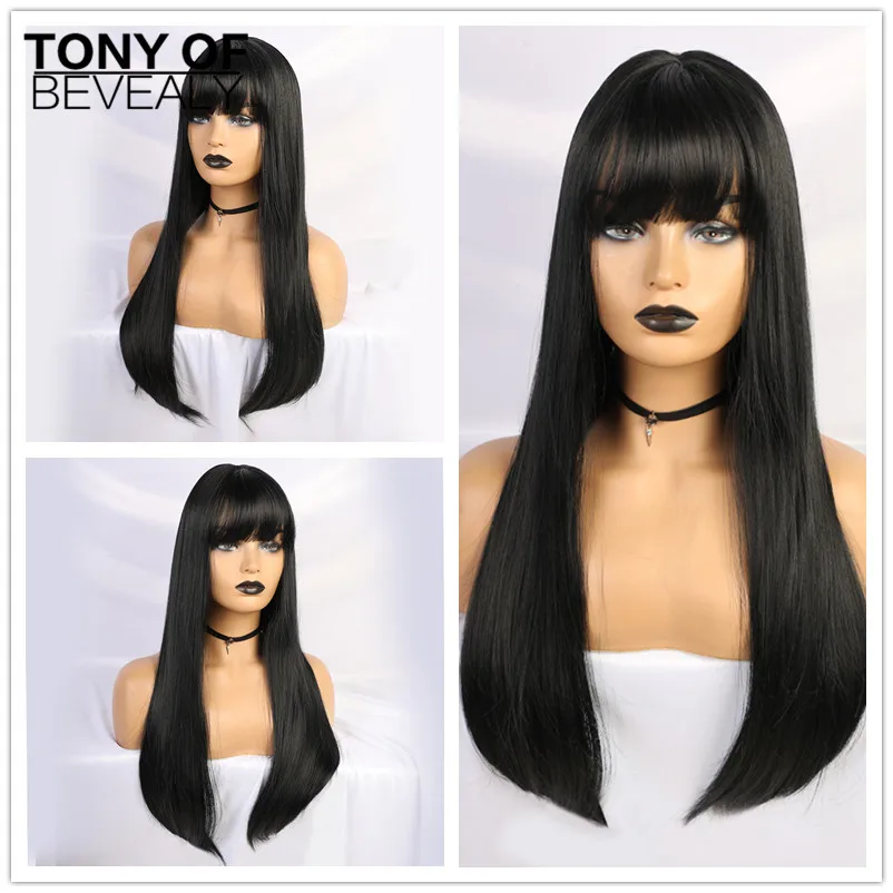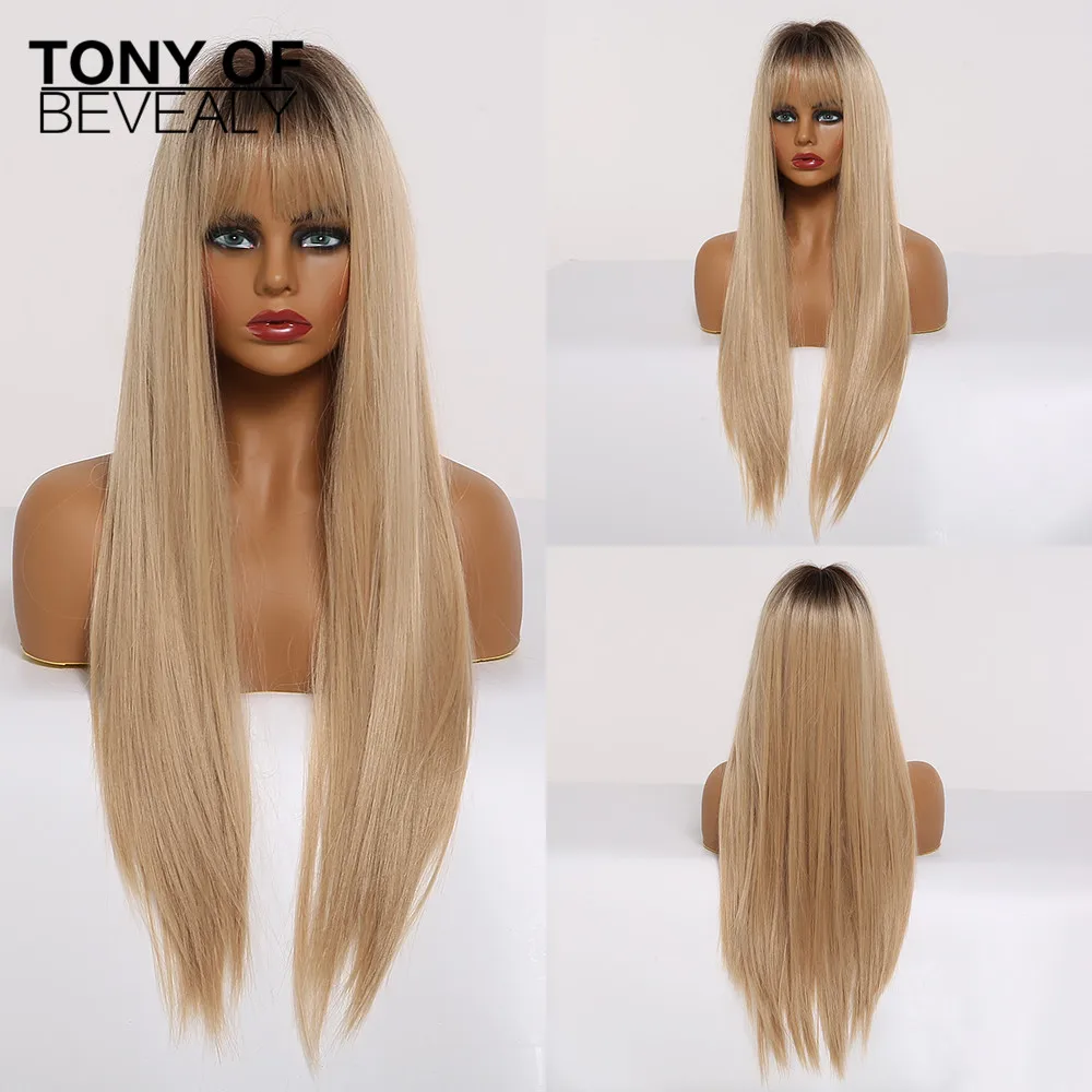 Длинные прямые синтетические парики, коричневый, синий, серый цвет, Омбре, волосы с челкой для афро женщин, косплей, натуральные парики, Термостойкое волокно