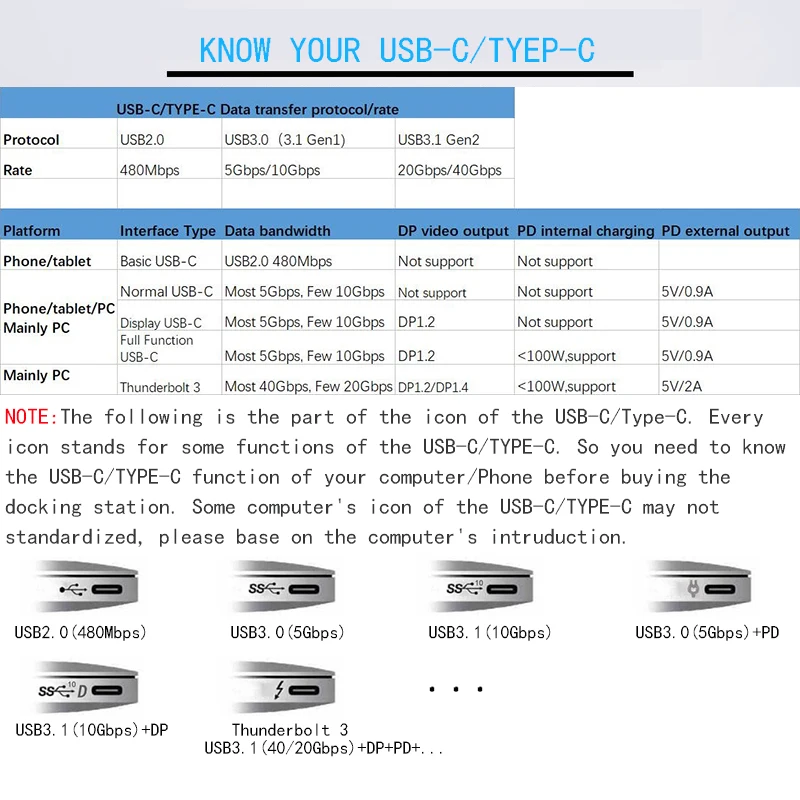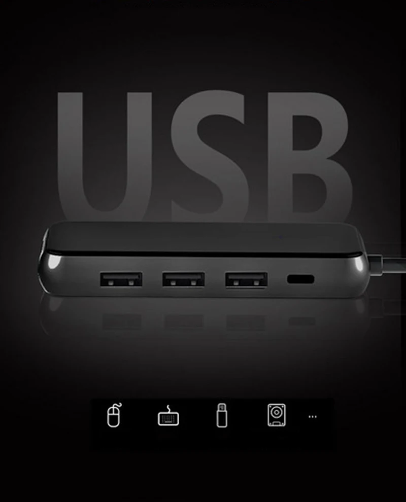 USB-C PD (только зарядка) 1. USB-C интерфейс с USB3.1 стандарт 2.USB-C интерфейс поддерживает вперед и назад подключаемого модуля 3. Поддерживает зарядку PD до 87 Вт. 4. В порту используется черный пластиковый сердечник + никелевый корпус Интерфейс USB 3,0: 1. Использование стандартного интерфейса для USB-A 2 в соответствии со стандартом USB 3,0, 5 Гбит/с 3. Поддержка чтения и записи данных, U-диск, картридер, клавиатура, мышь, съемный жесткий диск Расширенная Внешняя память, передача данных, заряженные SSD, цифровые камеры и т. Д. 4.USB3.0 мощность одного порта power 4,5 W (5V / 0.9A) поддерживает мобильные телефоны и другие устройства для зарядки 5 используется синий пластиковый сердечник + покрытие TF карта памяти держатель для карт 1. Стандартный разъем для tf-карты 2. Использование стандартной теорией передачи данных USB 2,0: 480 Мбит/с Памяти SD Держатель для карт 1. Стандартный слот для sd-карты 2. Используется стандартная теория передачи данных USB 2,0: 480 Мбит/с. HDMI интерфейс: 1. Использование стандартного интерфейса для HDMI-A 2. Поддержка передачи аудио и видео, поддержка видео 4K * 2K / 30 Гц и обратная совместимость 3. Черный пластиковый сердечник + никелированный корпус RJ45 интерфейс: 1. Gigabit LAN RJ45 Поддержка скорость передачи данных с 10/100/1000 м Примечание: 1. Устройство должно поддерживать «Альтернативный режим DisplayPort» (режим DP Alt) через TYPE-C, если нет, то не может использовать HDMI или VGA для видеовыхода. В то же время, что вам нужно, чтобы убедиться в том случае, если TYPE-C вашего устройства поддерживает одновременную зарядку/аудиовыход/сеть передачи и так далее. Не все интерфейсы Type-c имеют эти функции. 4. Не может поддерживать питание жесткого диска USB, более чем "5 в 900 мА"