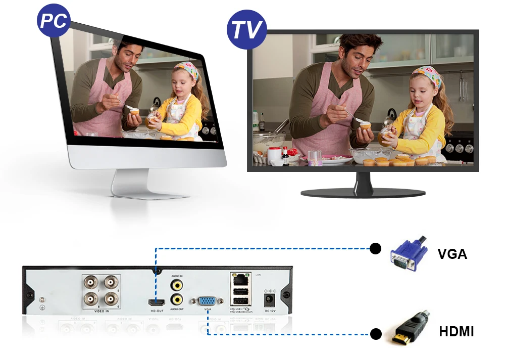 Легко отображать видео через порт HDMI вашего монитора компьютера, чтобы в полной мере воспользоваться ясностью системы безопасности. (Кабель HD не входит в комплект)