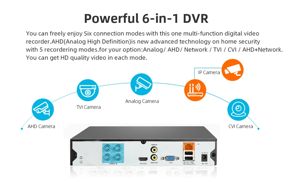 Вы можете свободно наслаждаться шестью режимами подключения с помощью этого многофункционального цифрового видеорегистратора. AHD (аналог высокой четкости)-новая передовая технология домашней безопасности с 6 режимами записи. Для вашего варианта: Аналог/AHD/Сеть/TVI / CVI / AHD + сеть. Вы можете получить видео высокого качества в каждом режиме.