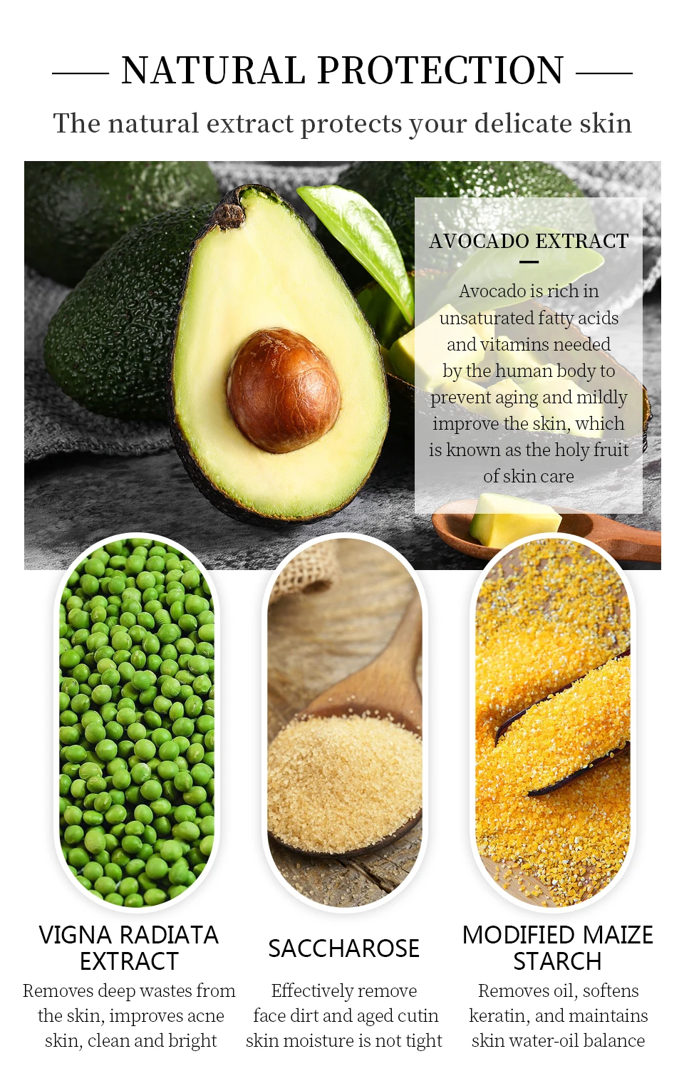 Натуральный Экстракт защищает нежную кожу Экстракт авокадо Авокадо богат inunsaturated жирных acidsand витамины neededby человеческого тела toprevent старения и mildlyimprove кожные покровы, whichis известен как святой фрукты Средств по уходу за кожей Вигны. Экстракт Удаляет глубокие отходы переработки Кожные покровы, улучшает acneskin, чистый и яркий Сахароза Модифицированный кукурузный крахмал Удаляет кожный жир, softensface грязь и в возрасте срезают на кератиновых пластинах, и maintainsskin влаги нет жесткой кожи водно-жировой баланс