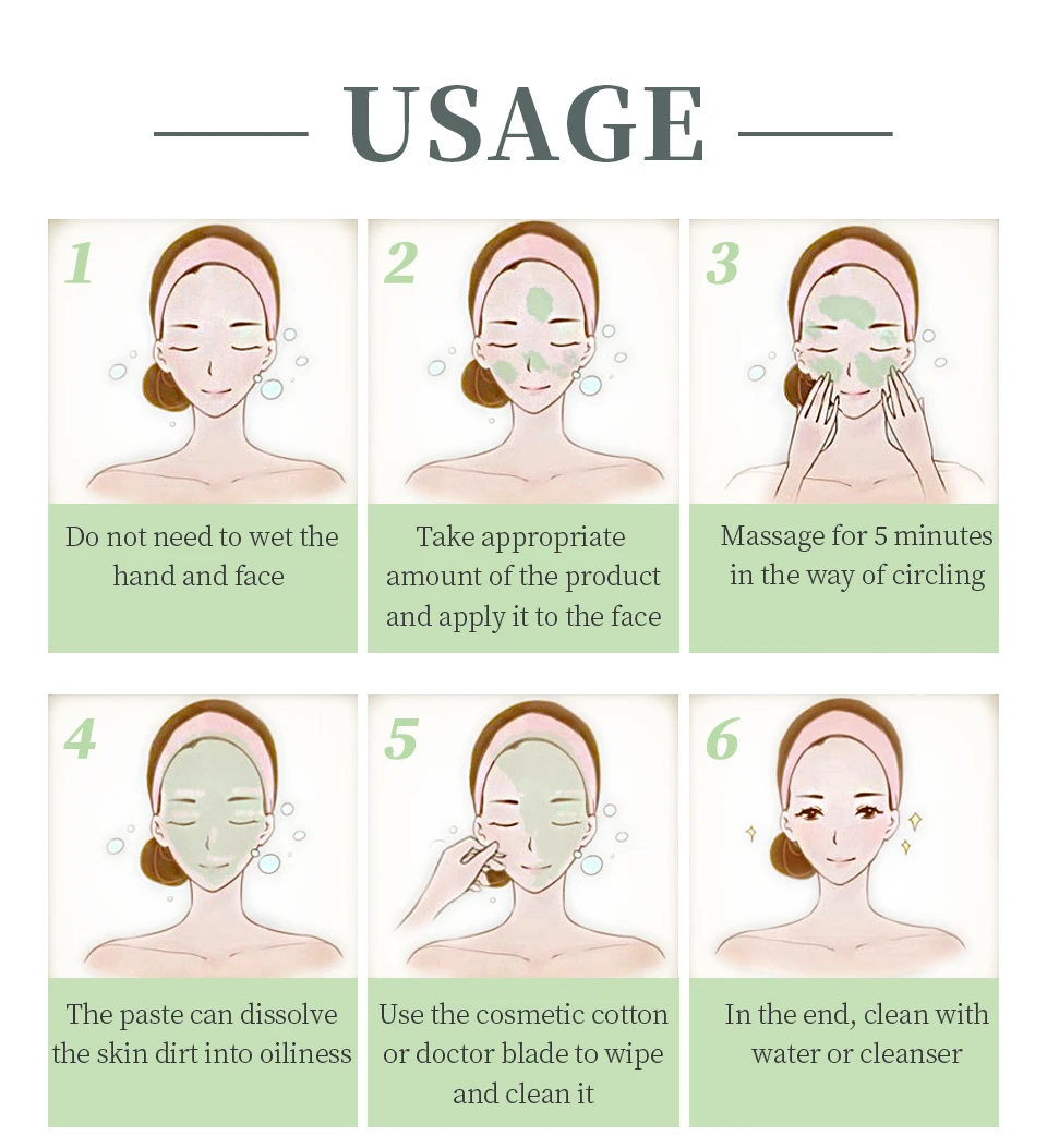 1) не нужно намочить руки и уход за кожей лица 2; Выбирайте appropriateamount в и упаковки нанесите ее на лицо 3 массаж для 5 minutesin путь по кругу 4 пасты могут растворять Используйте косметический cottonthe очищает забитые поры в жирности или ракельный нож, чтобы вытереть И очистить его 5 в конце концов, промойте чистой водой или моющее средство