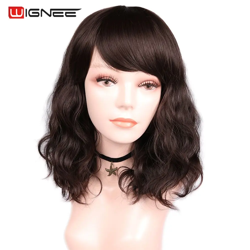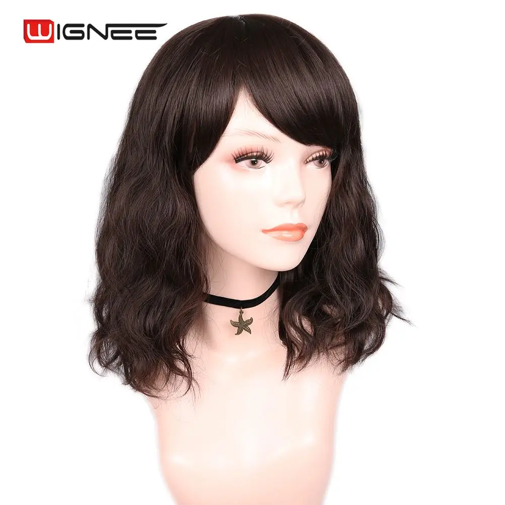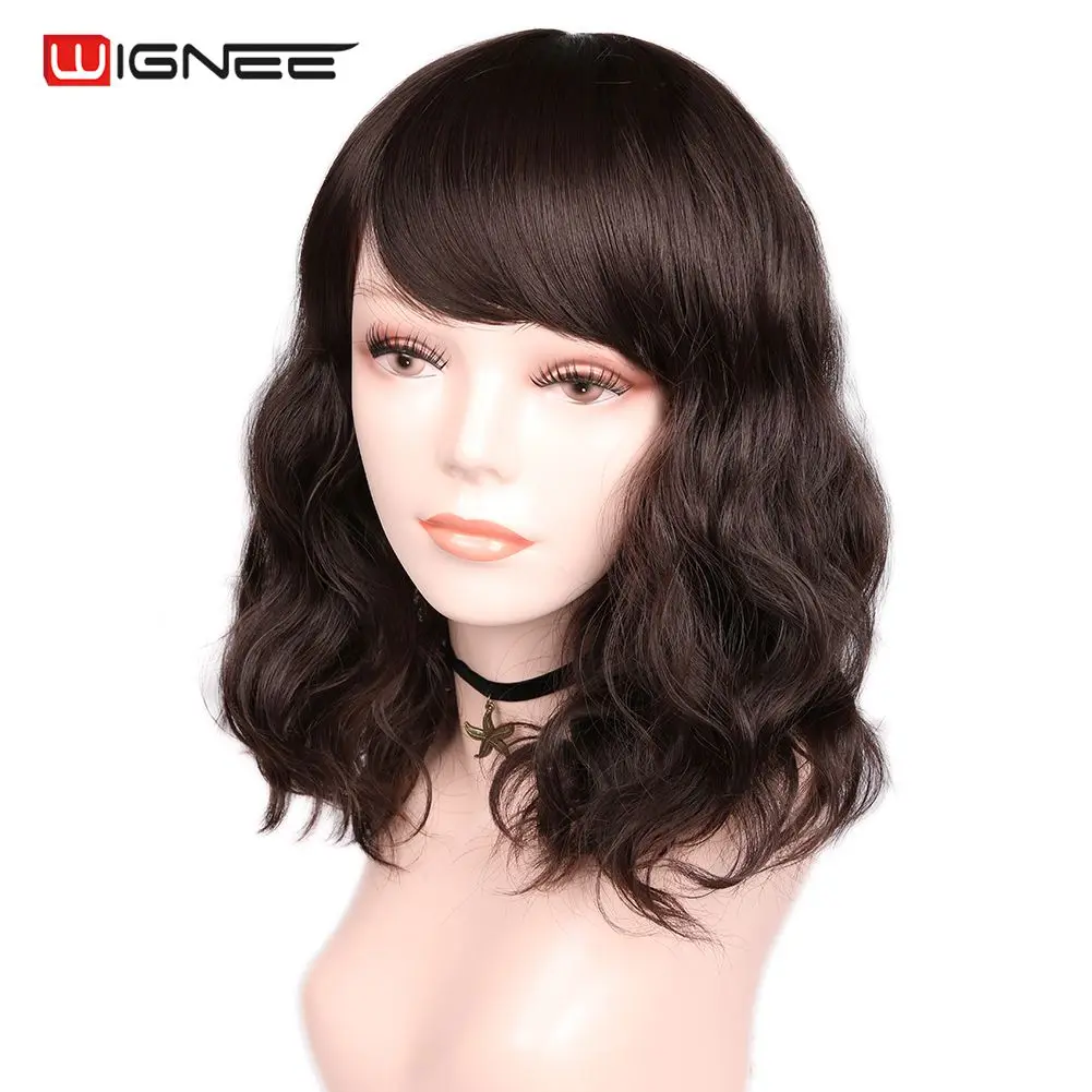 Wignee синтетические короткие черные/коричневые парики с челкой, волнистые волосы, термостойкие, повседневные, натуральные волосы, накладные, повседневные, женские парики