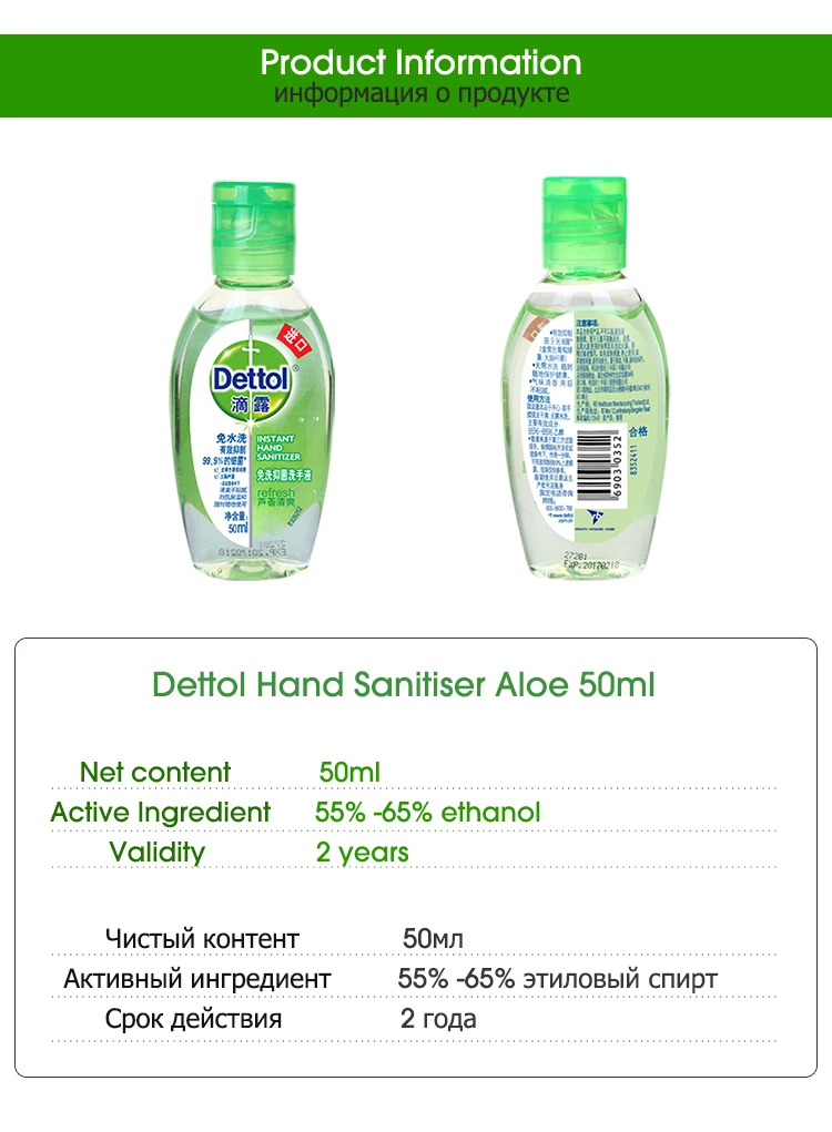 Dettol 50 мл Алоэ дезинфицирующее средство для рук гель 99.9% Антибактериальный портативный одноразовый без очистки для взрослых детей антибактериальный гель