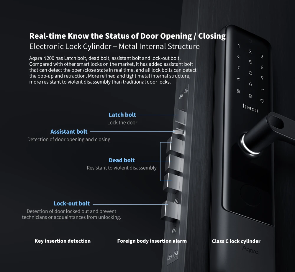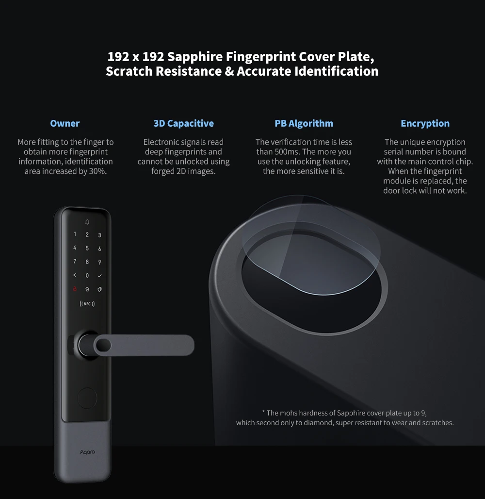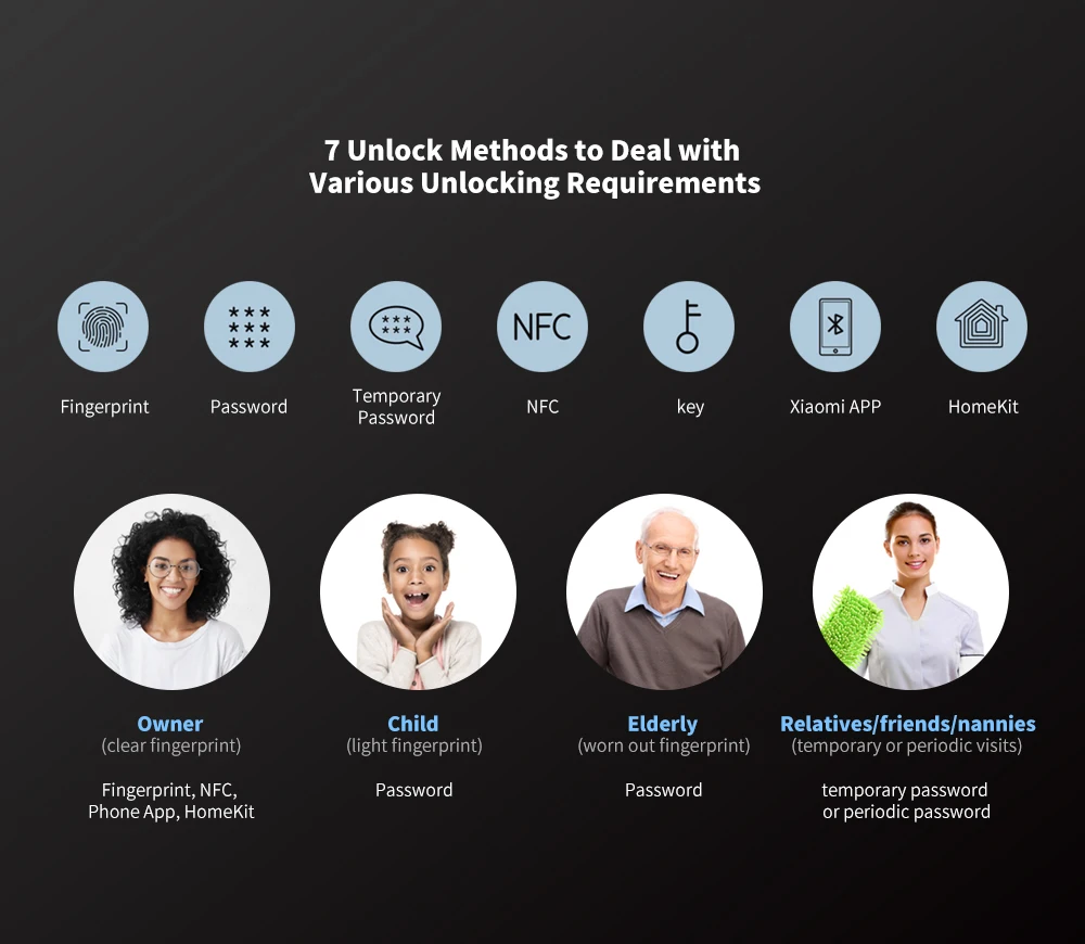 Разблокировка с отпечатком пальца, паролем, временным паролем, механическим ключом, NFC (поддерживается только Xiaomi phone, Mi band 4, последние часы), мобильный телефон Bluetooth, HomeKit.