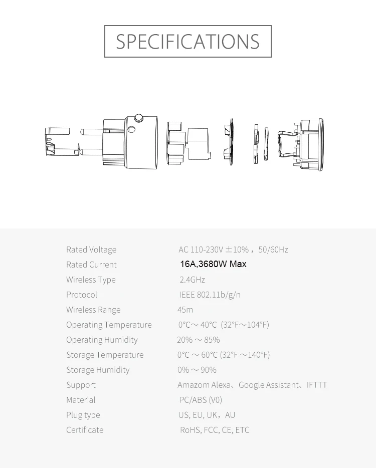 Номинальная Напряжение: AC 85-230V +-10% В переменного тока, 50/60 Гц Номинальный ток: 16A Максимальная общая мощность: 3680 Вт Особенности Engery Power Monitoring Беспроводной Тип: 2,4 ГГц Протокол: IEEE802.11b/g/n Беспроводной диапазон: 45 м Рабочая температура: 0-40 градусов (32F-104F) Операционная Влажность: 20%-85% Температура хранения: 0-90% Поддержка: Amazon alexa,goole assistant,IFTTT Материал: PC/ABS(V0) Тип вилки: ЕС Сертификат: ROHS,FCC,CE и т. д.