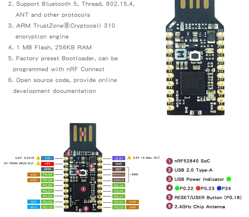 В nRF52840 микро дев комплект USB ключ Особенности программируемая кнопка пользователя, RGB светодиодный, до 12 GPIO и 2,4G Чип антенна на борту самолета.