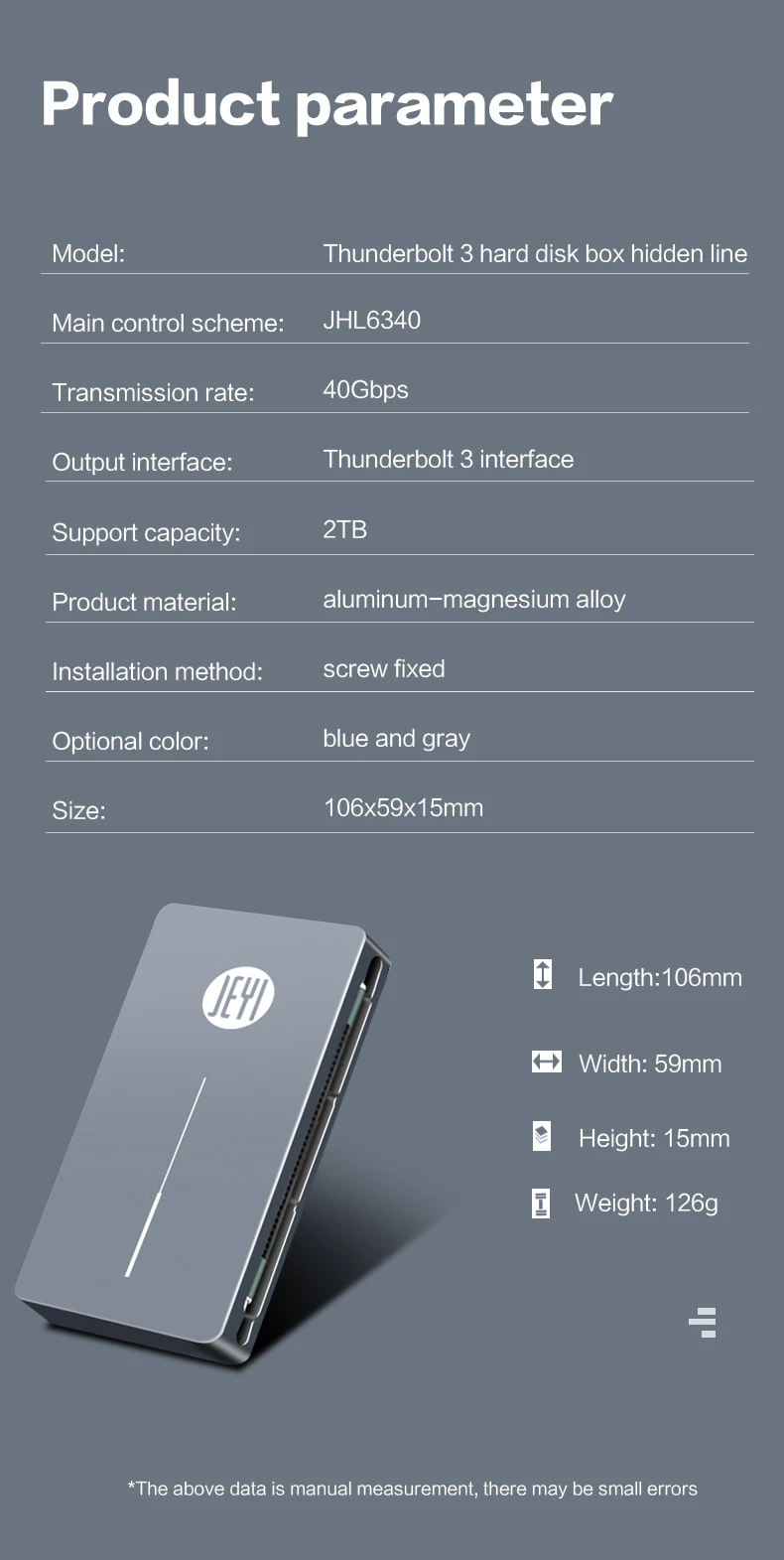 Модель: Скрытая линия мобильного жесткого диска NVMe Thunderbolt 3 M.2 Основная схема управления: JHL6340 Скорость передачи: 40 Гбит/с Выходной интерфейс: интерфейс Thunderbolt 3 Поддержка: 2 ТБ Материал изделия: алюминиево-магниевый сплав Способ установки: фиксированный винт Дополнительный цвет: синий и серый Размер: 106x59x15 мм Длина: 106 мм Ширина: 59 мм Высота: 15 мм Вес: 126 г Приведенные выше данные являются ручными измерениями, могут быть небольшие ошибки