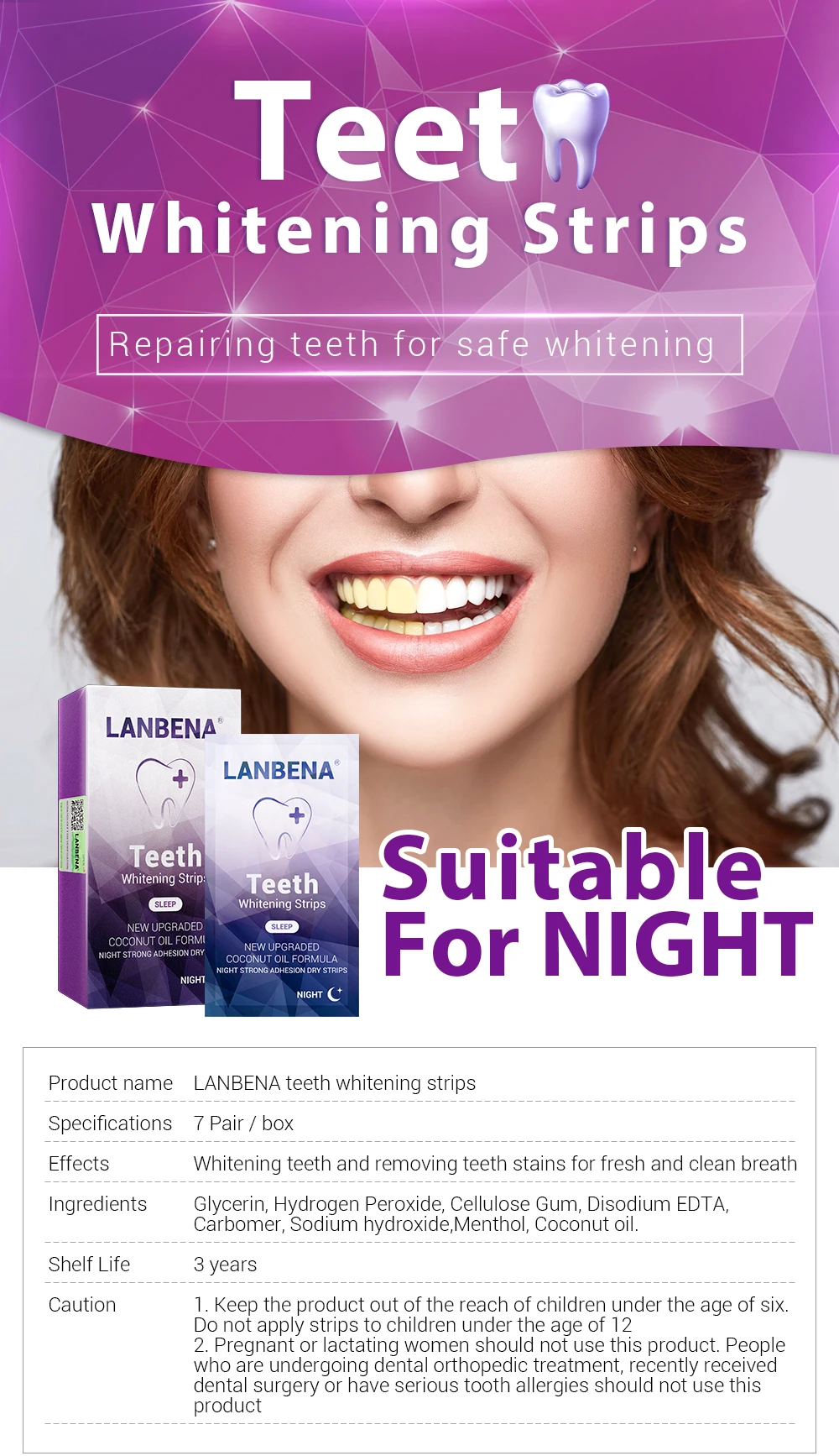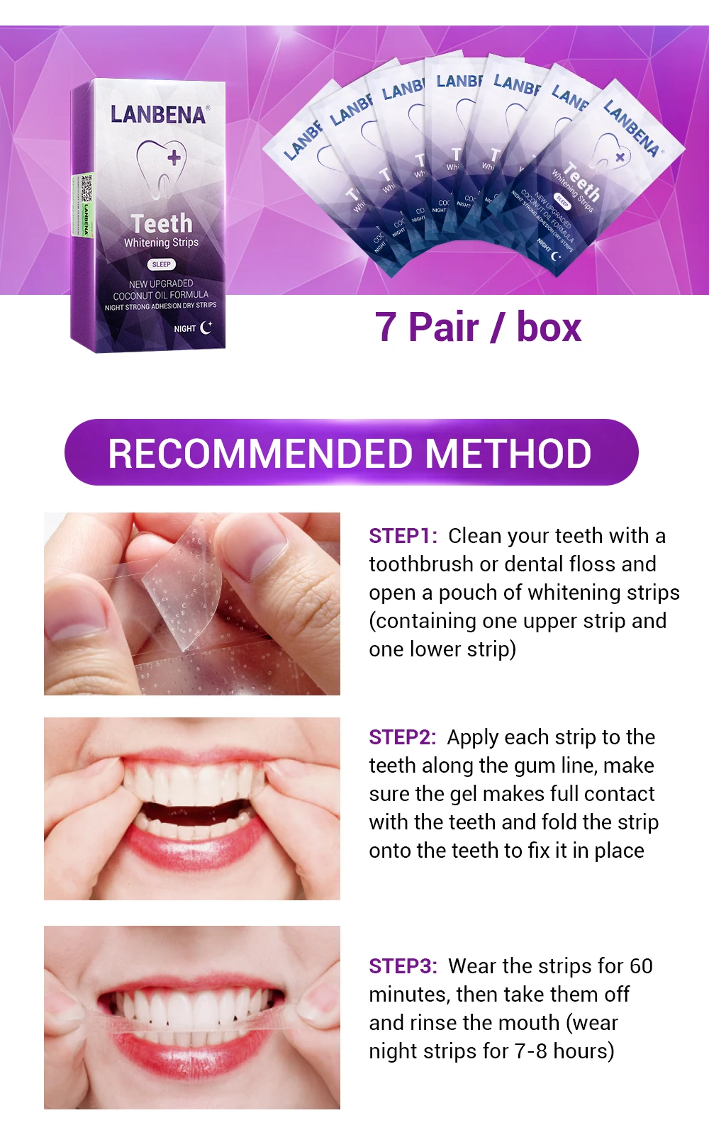 LANBENA отбеливание зубов полоски для ночного зубов, для гигиены полости рта Фанера белые полоски Удаляет налет Красители легко носить 7 пар/кор.