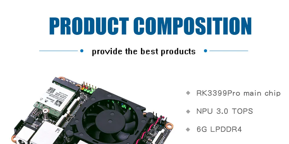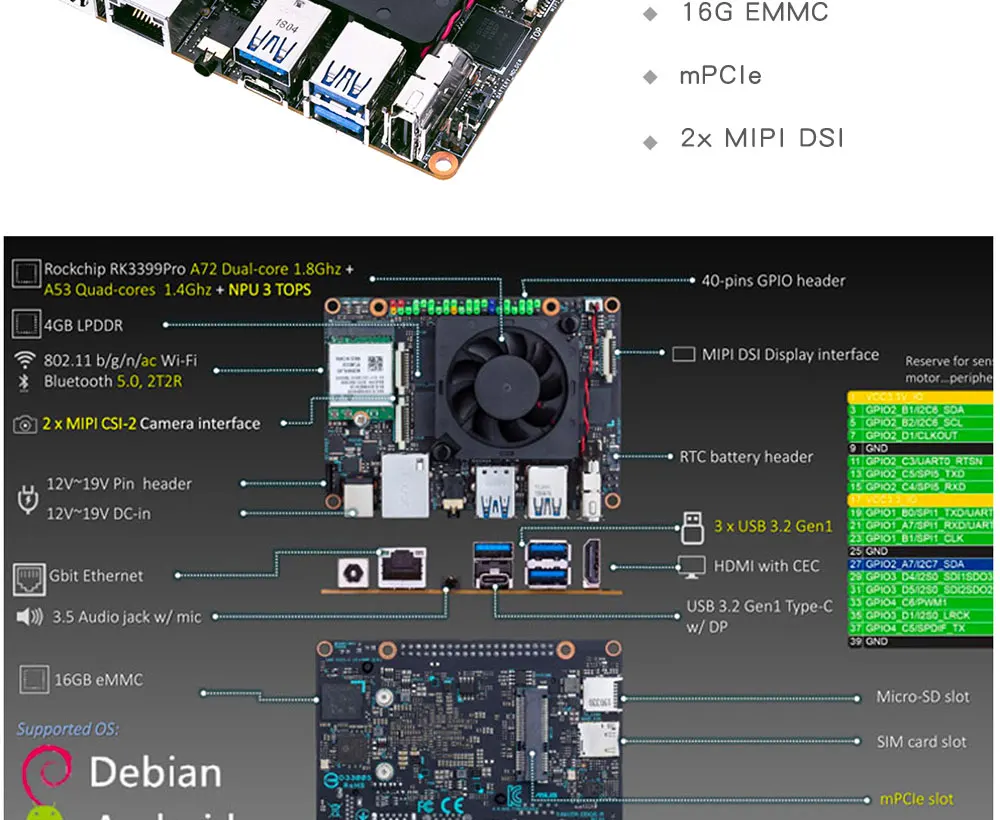 SoC - Rochchip RK3399Pro шестиядерный большой. Маленький процессор с 2 ядрами Cortex A72 до 1,8 ГГц, 4 ядрами Cortex A53 @ 1,4 ГГц, графический процессор Arm Mali-T860 MP4 до 800 МГц с OpenGL ES 1,1 до 3,2, OpenVG1.1, openCL 1,2 и DX 11 Поддержка, и NPU поставка до 3,0 топов Системная память-4 Гб двухканальная LPDDR4 память для системы, 2 Гб LPDDR3 память для NPU Память-16 Гб флэш-памяти eMMC, слот карты micro SD Видеовыход-HDMI, порт дисплея через порт USB-C, До 2x разъема MIPI DSI (один разъем MIPI мультиплексируется с DSI или CSI в наличии) Аудио-3,5 мм аудио разъем Камера-до 2х разъемов MIPI CSI-2 Подключение-Gigabit Ethernet, 802.11ac WiFi 5, Bluetooth 4,2 2T2R USB - 3 порта USB 3,1 gen1, 1 порт USB 3,1 gen 1 type-C OTG Расширение Слот mPCIe для 4G/LTE Расширенный; Слот для карт nanoSIM бортовой 40-контактный разъем GPIO с таким же разъемом, как и оригинальная плата Tinker с I2C, SPI, UART, PWM, I2S и GPIO Разъем Misc-аккумулятор RTC, разъем питания, разъем для кнопки сброса Питание от-12 В до 19 в на входе через гнездо питания или головку Размеры-100x72 мм (форм-фактор Pico-ITX)
