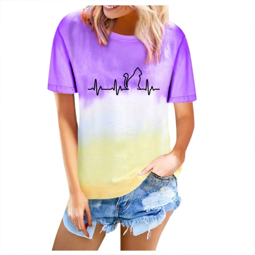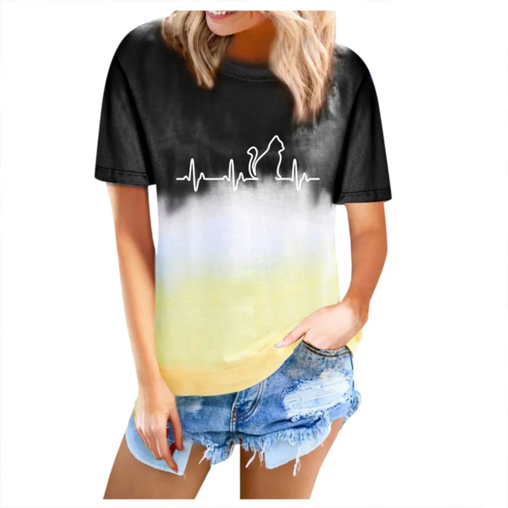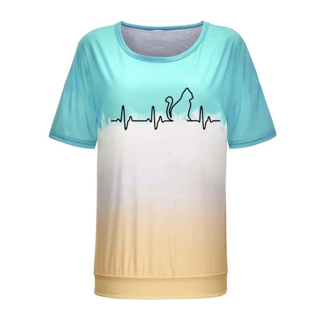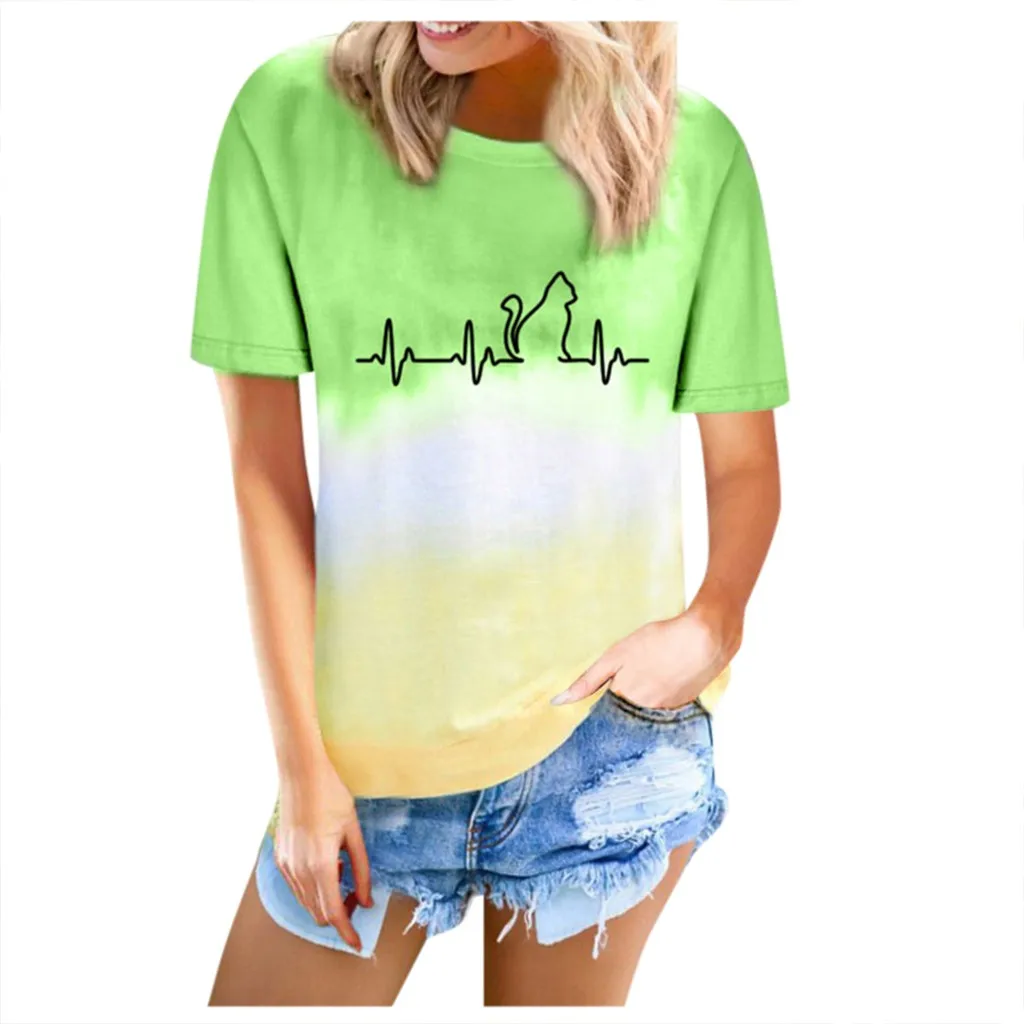 Футболки размера плюс, женская футболка с круглым вырезом, футболка с коротким рукавом и принтом в виде котика, повседневные свободные футболки