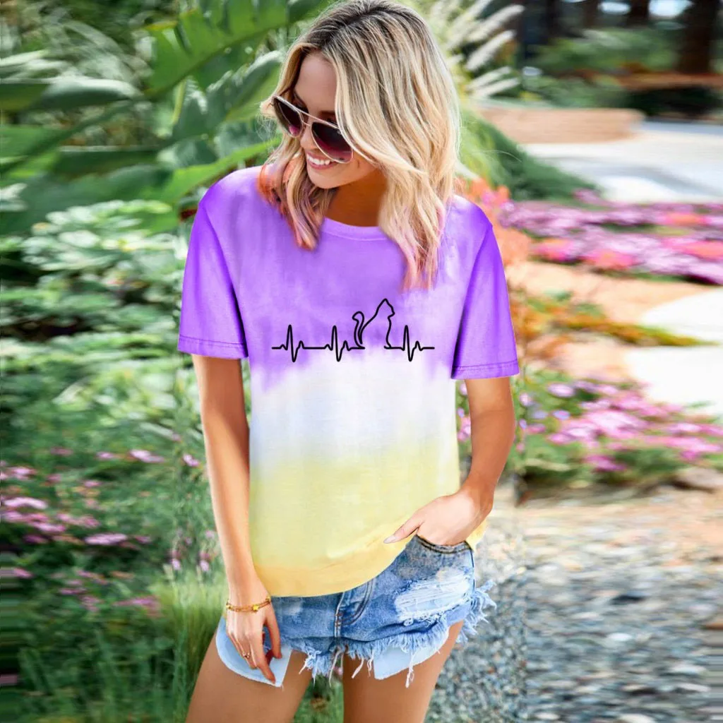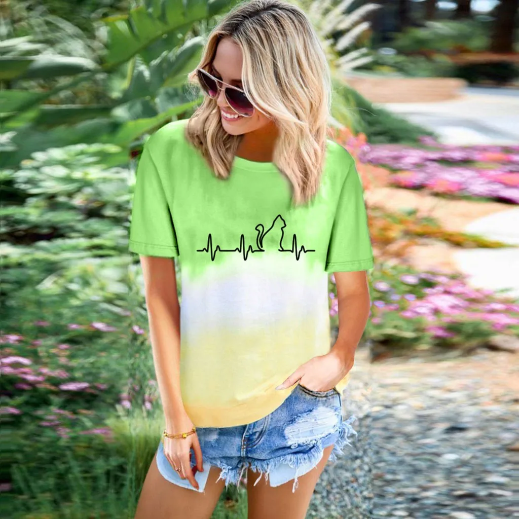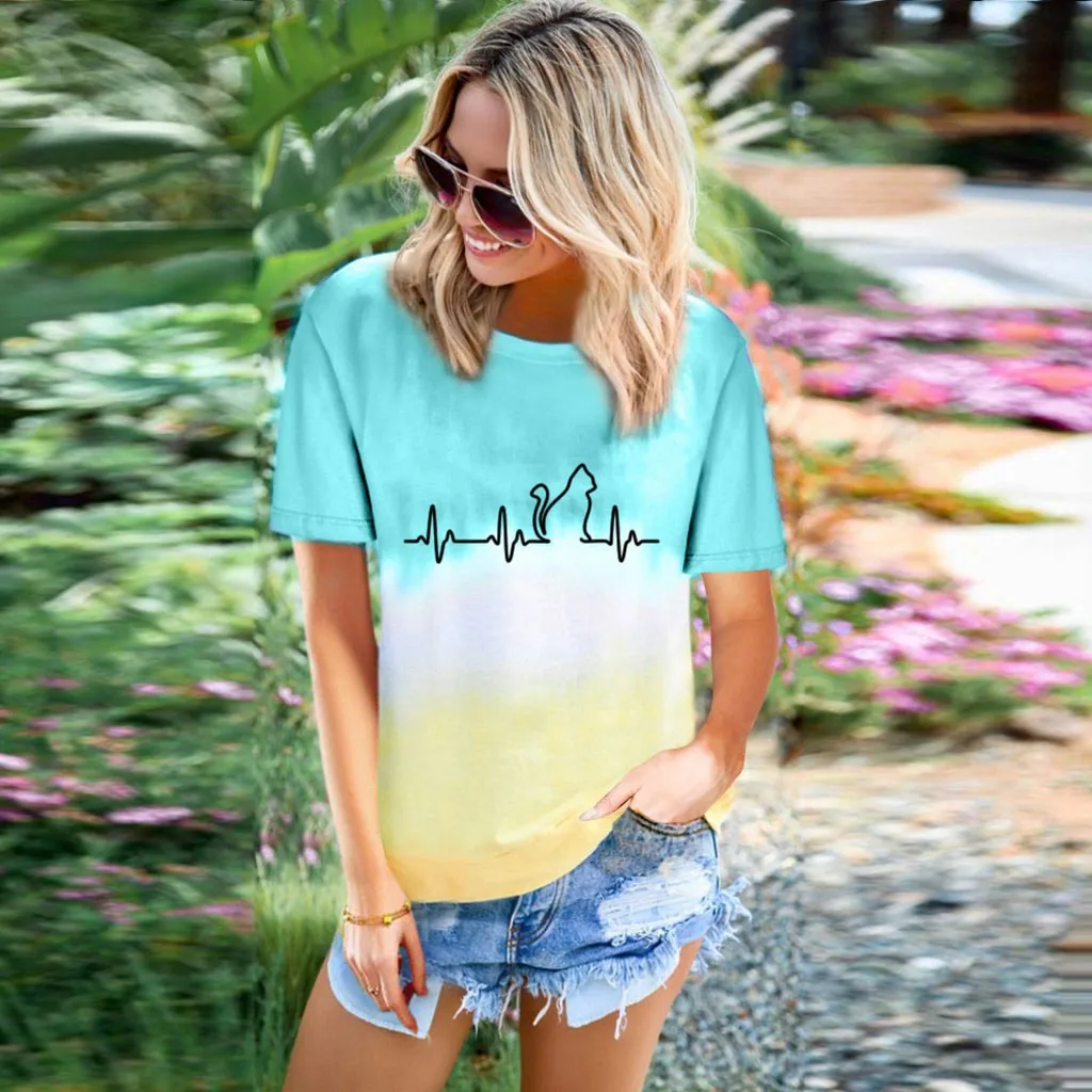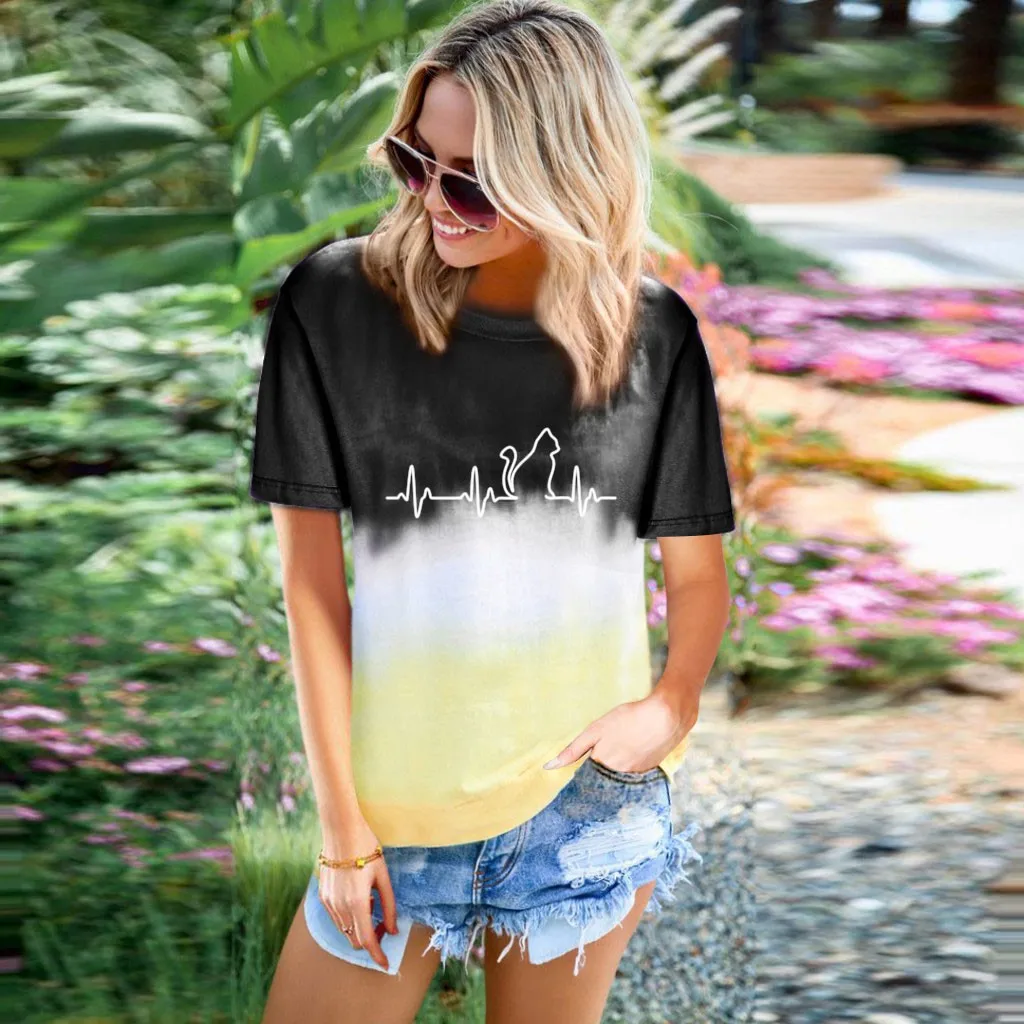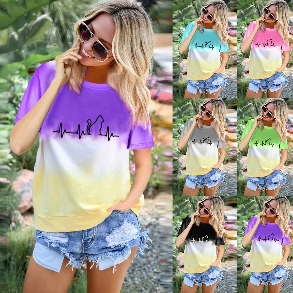 Футболки размера плюс, женская футболка с круглым вырезом, футболка с коротким рукавом и принтом в виде котика, повседневные свободные футболки