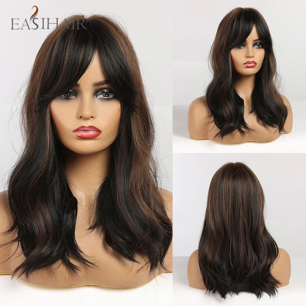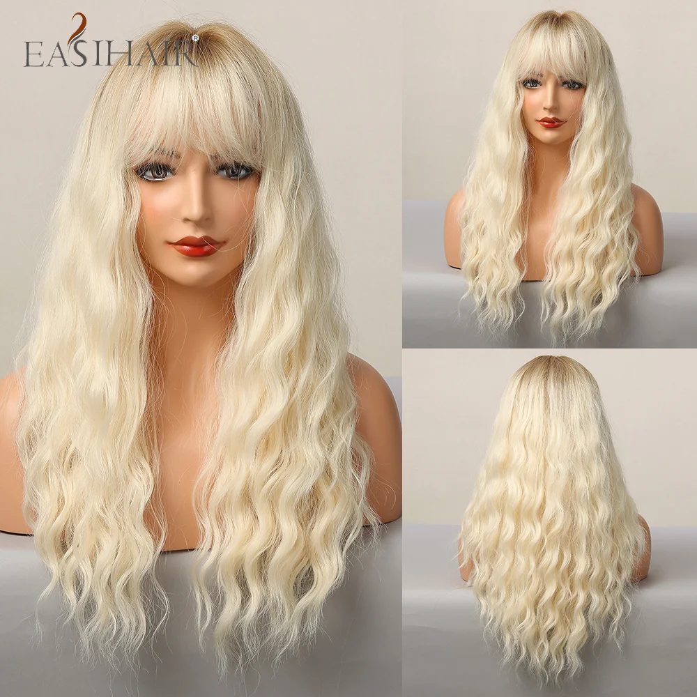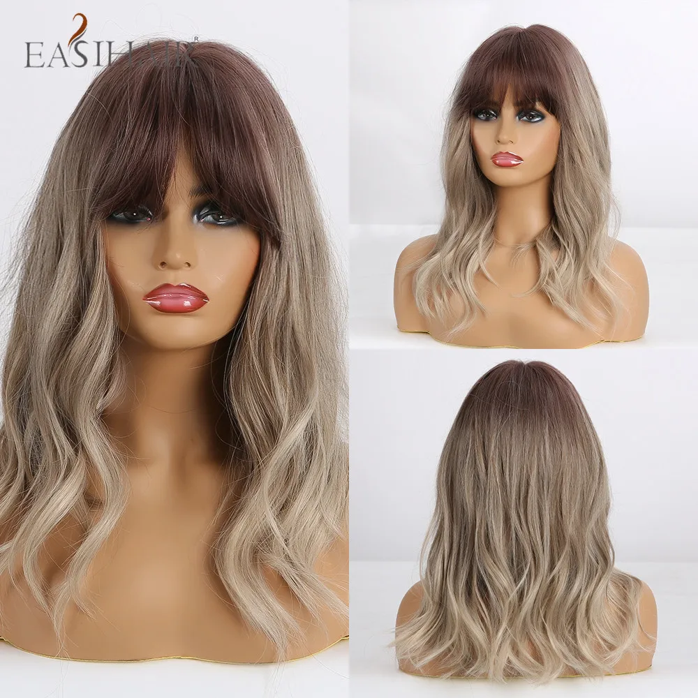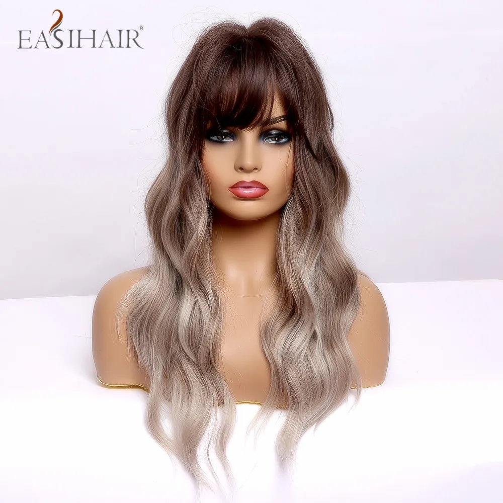 EASIHAIR, длинные, волнистые, черные, коричневые, пепельные, блонд, синтетические волосы, парики с челкой, термостойкие, косплей, натуральные парики для женщин