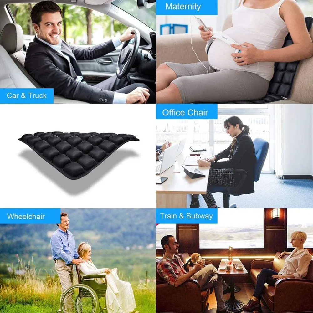 Features: 1.Working principle: Our seat cushion uses small mosaic cushion, which can be filled with air or water. Produces air convection technology and anti-gravity effects to provide support to your spine and even relieve pressure. The bottom cushion is soft, but it can still reduce the pressure on the thighs. 2.Cool technology: Add bland water to the inflatable cushion to help you cool down and expel heat, giving you a more comfortable experience. Don't worry: the waterproof pad is leak-proof, covered with durable TPU material, and no additional protective shell is needed. 3.Super practical: The air pillow is not only super comfortable, but also has 40,000 A-class anti-skid particles on the bottom, which are non-slip. The cushion can be inflated in a few seconds and can be used on your office chair, airplane or even car seat. Description: Mixed material that is comfortable to the skin and anti-wrinkle. The silk fabric is smooth and comfortable, at the same time it is spill-proof and durable, so you can use it for many years. Specifications: size:45*45cm color:black material:Polyester + spandex Package Included: 1*Air cushion Notes:1. Due to the difference between different monitors, the picture may not reflect the actual color of the item. We guarantee the style is the same as shown in the pictures.2. Please allow slight dimension difference due to different manual measurement.
