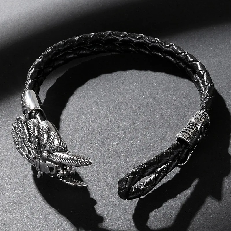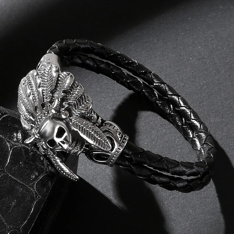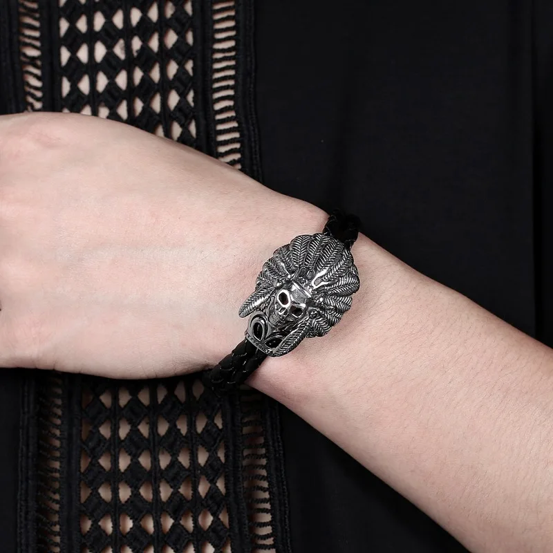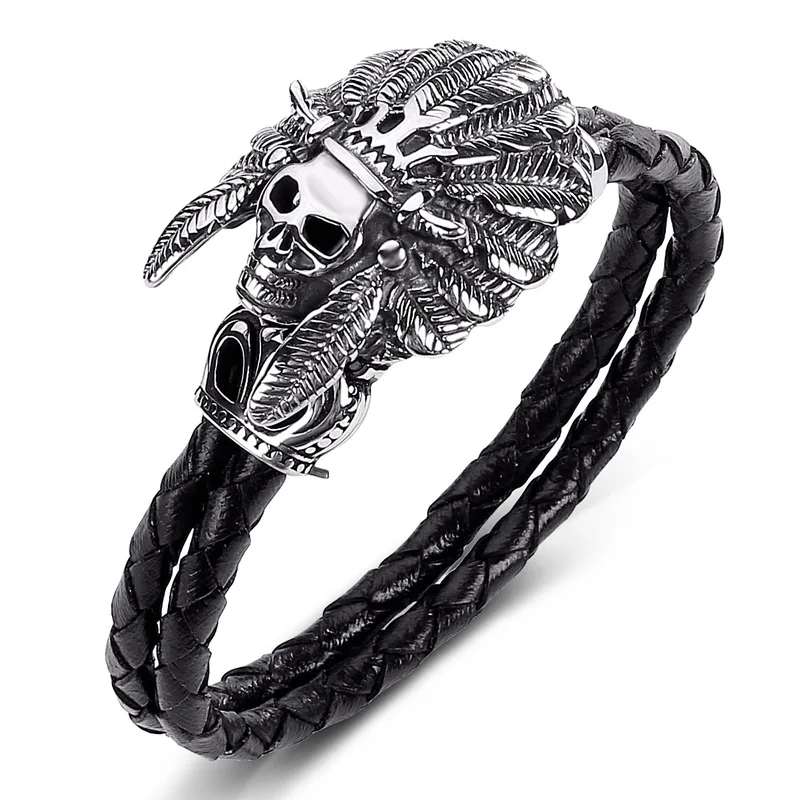 Товар: ZAER мужской браслет панк Нержавеющая сталь Мужской Индеец перья череп индивидуальный браслет мужской подарок кожаный браслет ювелирные изделия