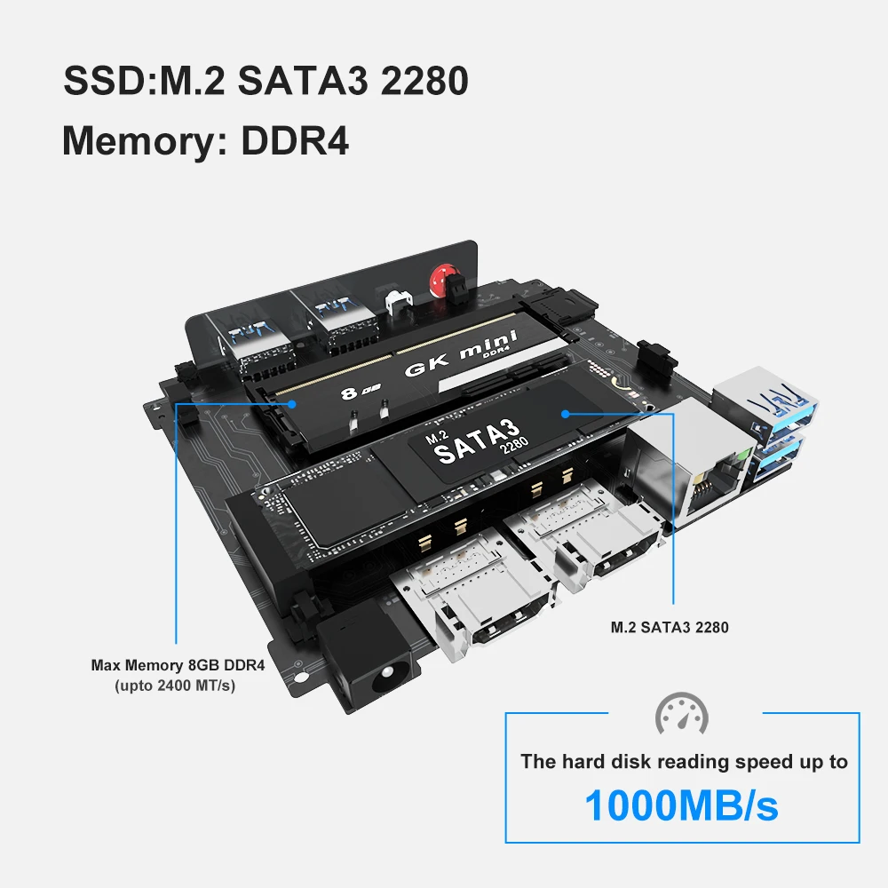Используйте ОЗУ DDR4 2400 МГц, которая может поддерживать до 8 Гб одноканальный. Слот для карт SSD-M.2 порт, поддержка протокола передачи SATA3, скорость передачи данных может достигать 1000 МБ/с./с, что позволяет свободно работать.